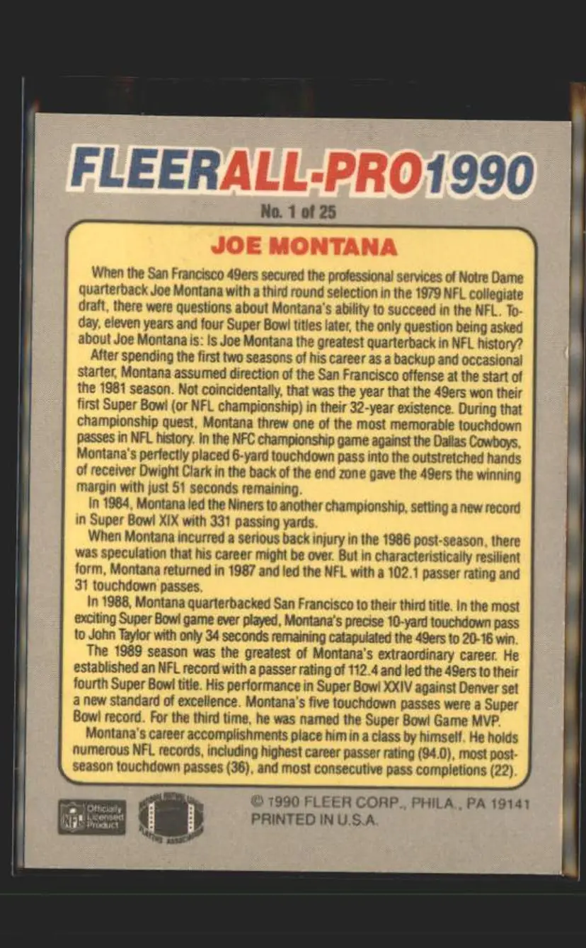 1990 Fleer #1 Joe Montana All-Pro - (137) - San Francisco 49ers