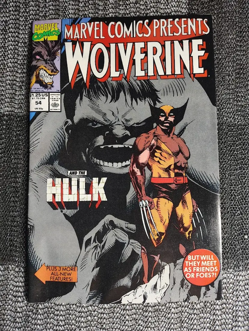 This 1990 Marvel Presents issue #54 features Wolverine and the Hulk, showcasing a classic confrontation between these popular characters. The cover art depicts Wolverine standing in front of a large, roaring Hulk, capturing a dynamic moment from the era. This is a key piece for collectors interested in the early 90s Marvel universe and the ongoing rivalry between these two iconic heroes.