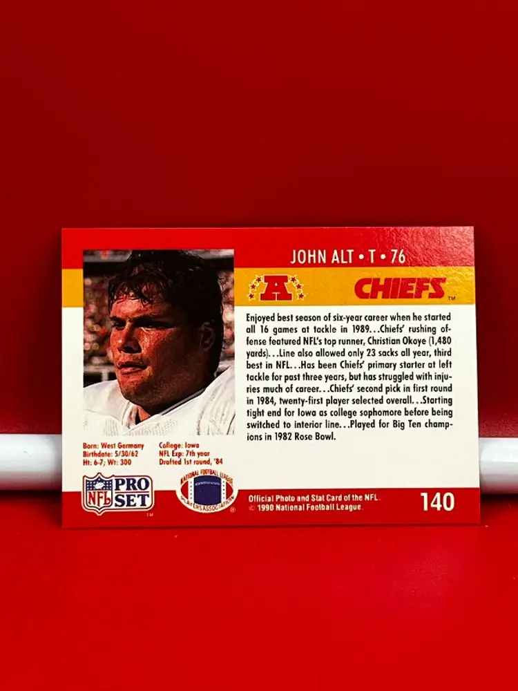 Hello, what we have is a Collector Trading Card by: Pro Set. Year: 1990. Team: Chiefs. Player: John Alt. Number: 140.