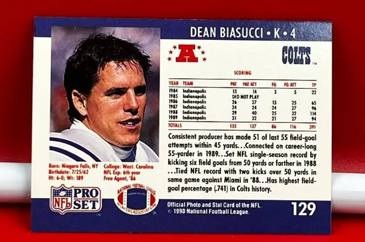 Hello, what we have is a Collector Trading Card by: Pro Set. Year: 1990. Team: Colts. Player: Dean Biasucci. Number: 129.