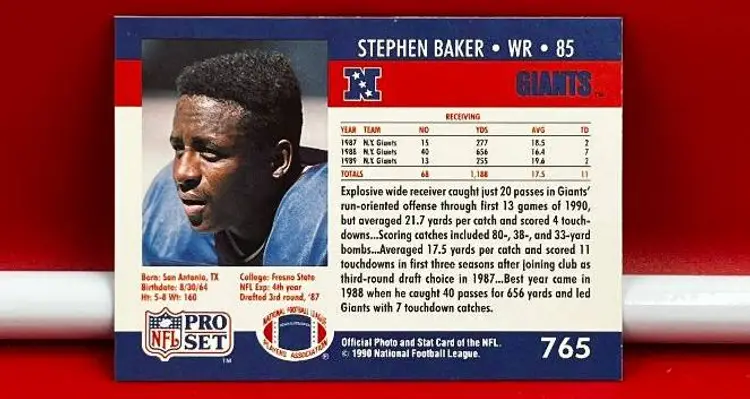 Hello, what we have is a Collector Trading Card by: Pro Set. Year: 1990. Team: Giants. Player: Stephen Baker. Number: 765.