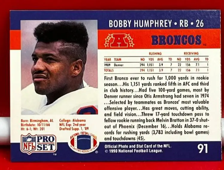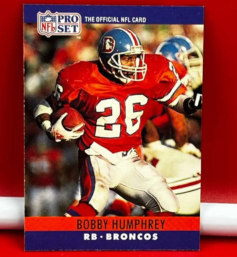 What we have is a Collector Trading Card by: Pro Set. Year: 1990. Team: Broncos. Player: Bobby Humphrey. Number: 91.
