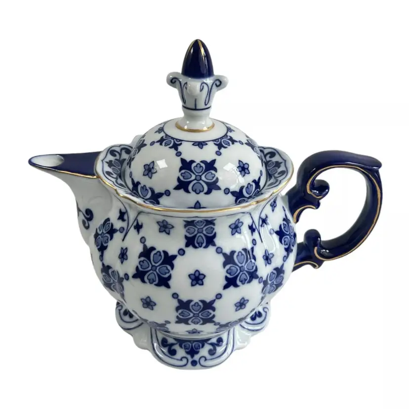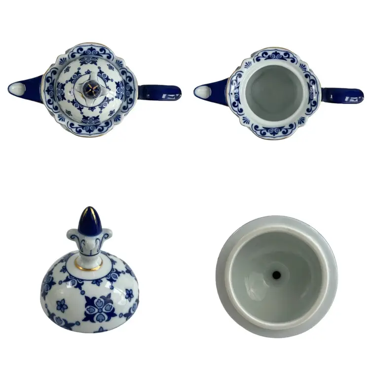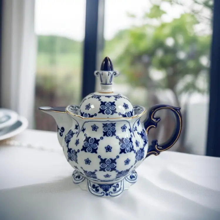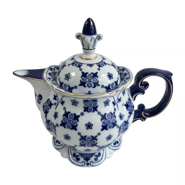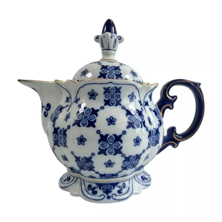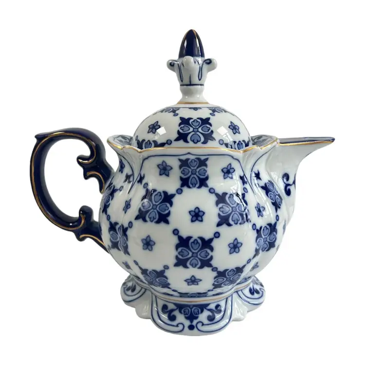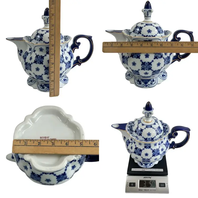 Brand: Bombay Company Pattern: Blue & White Floral with Gold Trim Material: Glazed Porcelain Origin: Made in China Dimensions: - Height: approx. 6.5 inches (with lid) - Width (handle to spout): approx. 8.5 inches - Base: approx. 4.75 inches wide Weight: approx. 3 lbs 5 oz Condition: Excellent pre-owned condition – no cracks or chips. See photos for details.