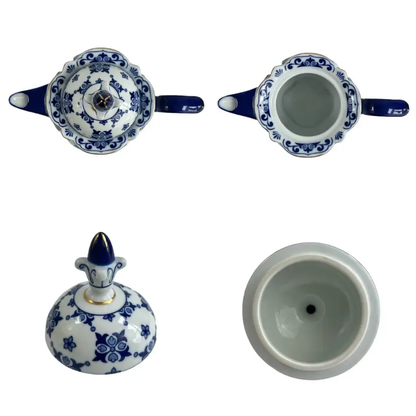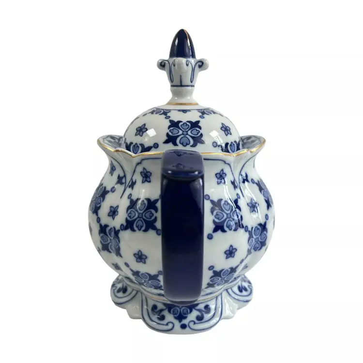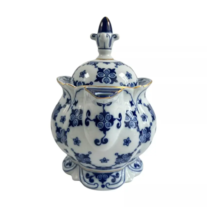 Features elegant floral motifs in cobalt blue, highlighted with gold trim, and a lidded top with a decorative finial. Whether for serving or display, this piece blends classic European-inspired design with timeless appeal.