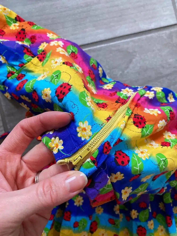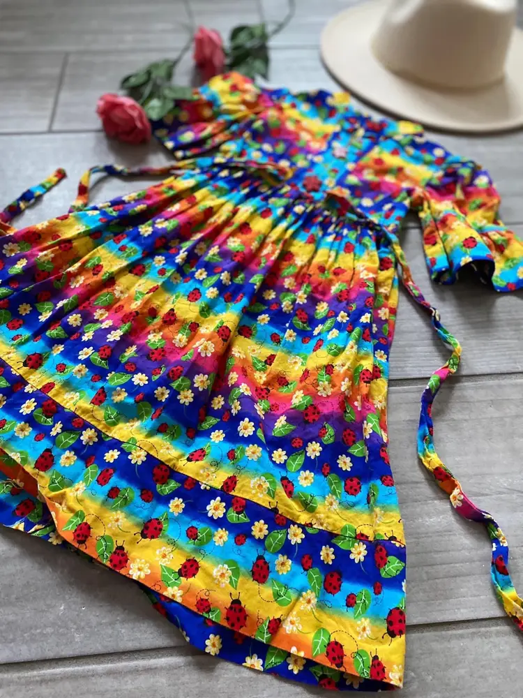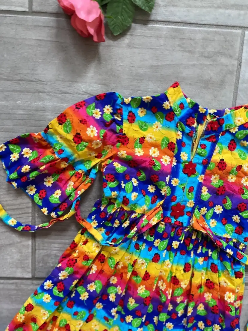 1990s does 1970s Girls Flower Power Dress🦋🌈✨ Super fun rainbow flower power dress. This one is a bit of a mystery to me. The fabric feels like a cotton blend and looks VERY 90s. It is vibrant and has lady bugs printed throughout. The small buttons below the collar look to be 70s and the collar/sleeves themselves are a very 70s cut. The backside zipper is 1970s. I am guessing this was made in the 90s with 70s materials + cut to give it a retro vibe to the max! Has a flared sleeve and backside tie. According to some size charts I believe this would work for a girls size 2/3T but please see measurements for best sizing.