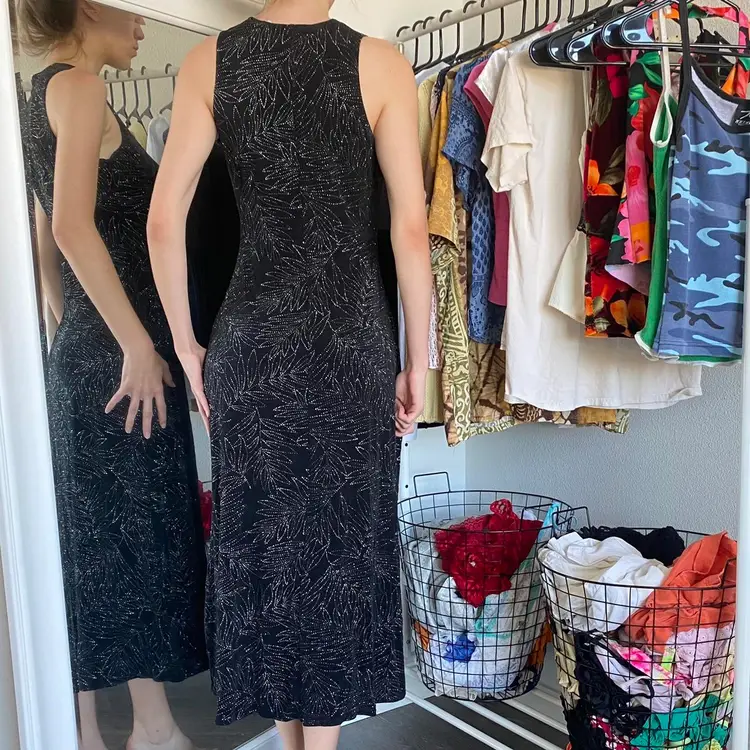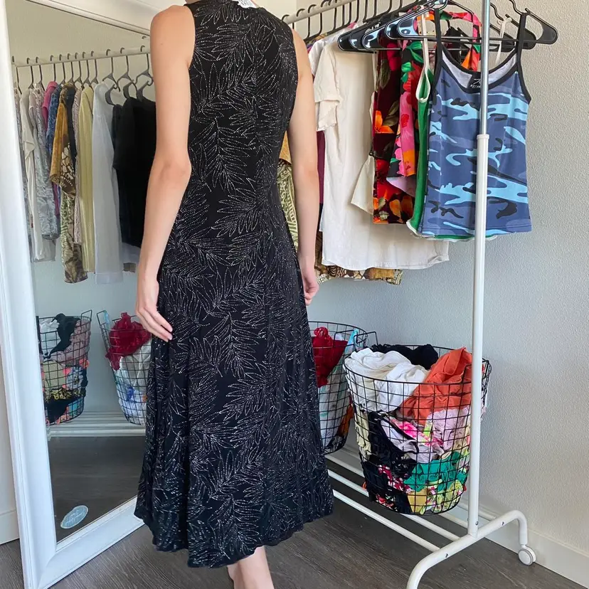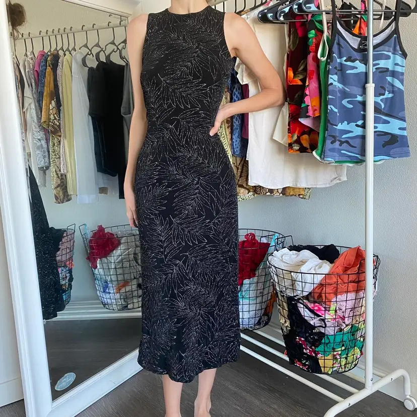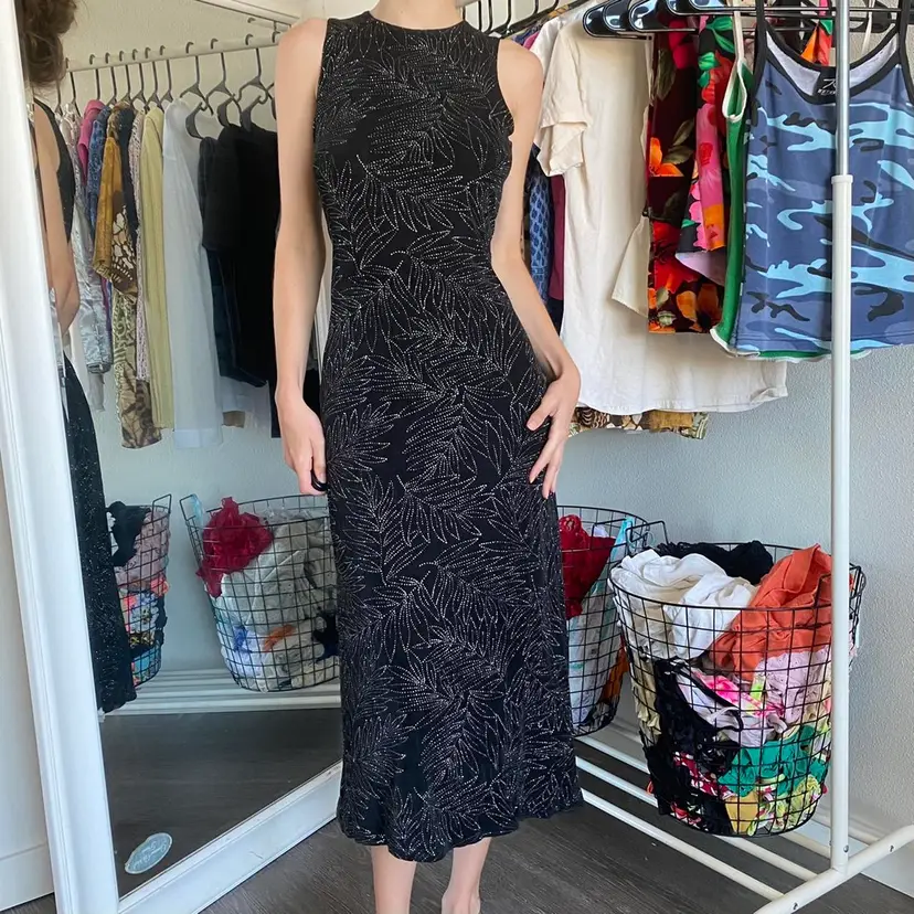 vintage, 1990’s, black, full length, gown/dress, with silver sparkly leaf print, a high neckline & made from stretchy fabric!