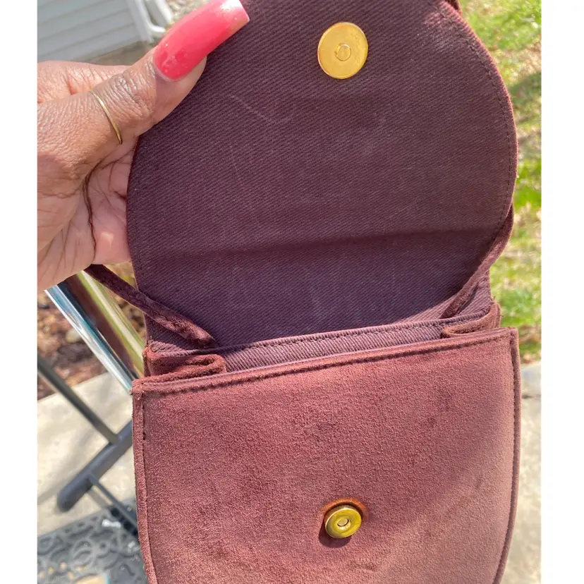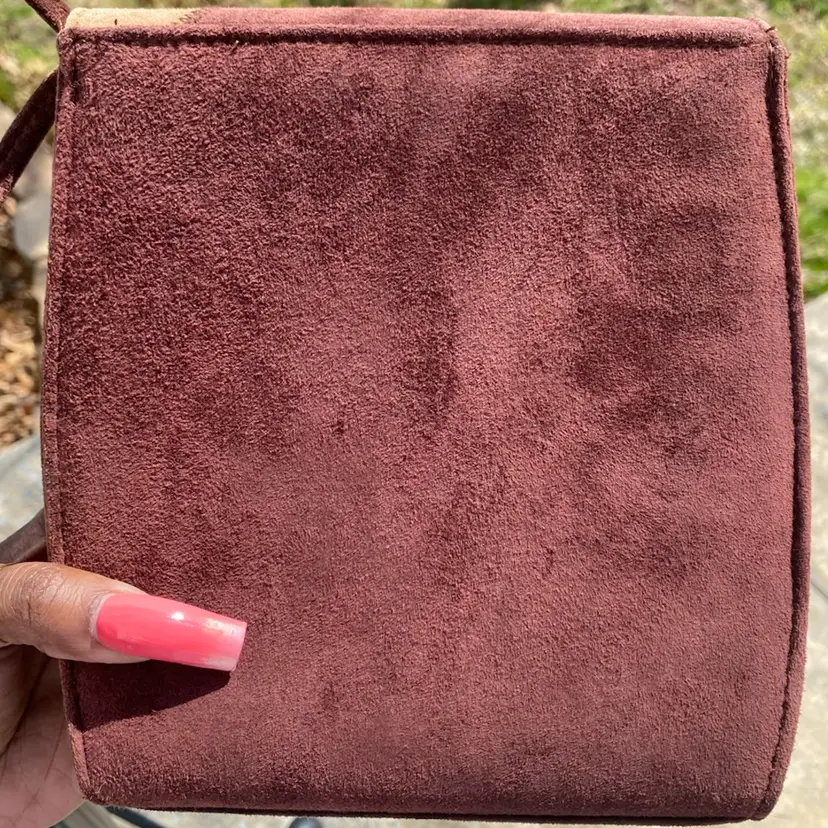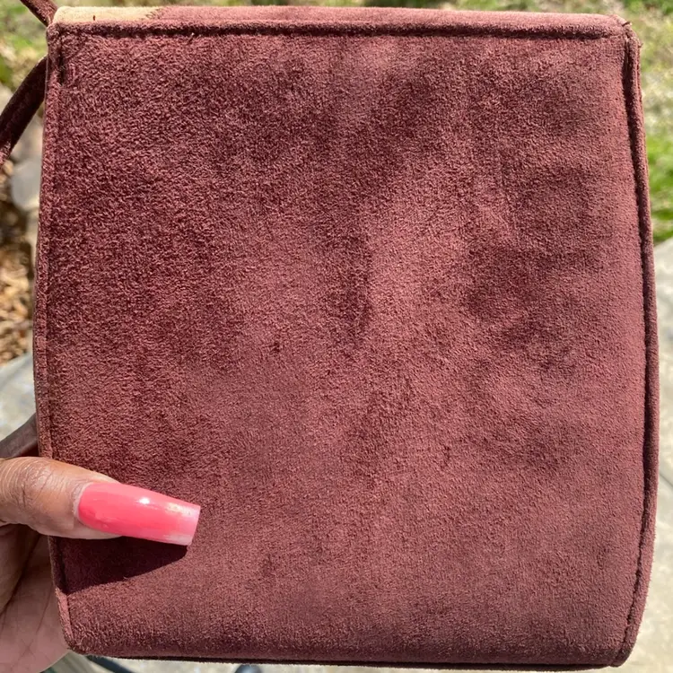 This suede handbag in perfect condition features a beautiful blend of earth tone colors, including brown and patches of tan, red, and yellow. Cute and stylish.