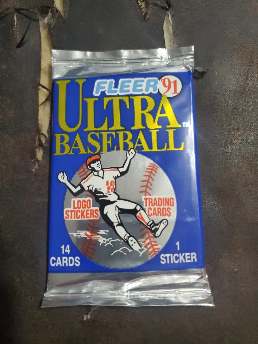 Unopened 1991 Fleer Ultra pack featuring 14 trading cards and 1 logo sticker. Perfect for baseball card enthusiasts and collectors!