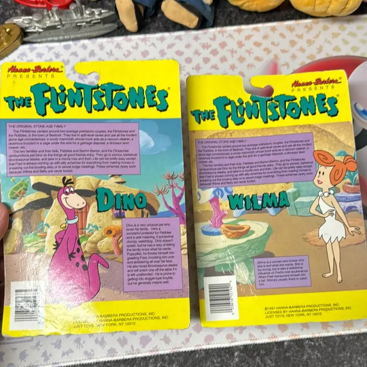 Packaging is a little beat up. Some slight bends on the card. Wilma’s in better shape. Dino has a crack in plastic on the left side.