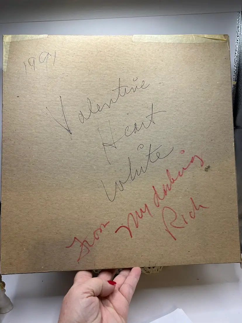 1991 Large White Lace & Satin Heart Box With Red Flower
