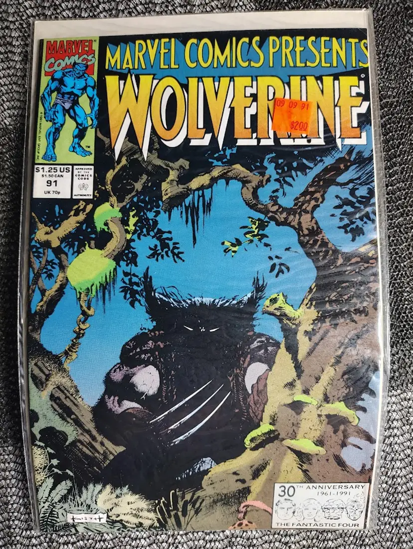 This 1991 Marvel Presents Wolverine #91 features a striking cover illustration of Wolverine in a feral, shadowy form amidst a dense, gnarled forest. The artwork highlights the character's wild nature and connection to the wilderness, a common theme in early 90s Wolverine stories. The cover also notes a "30th Anniversary" for The Fantastic Four, adding historical context.