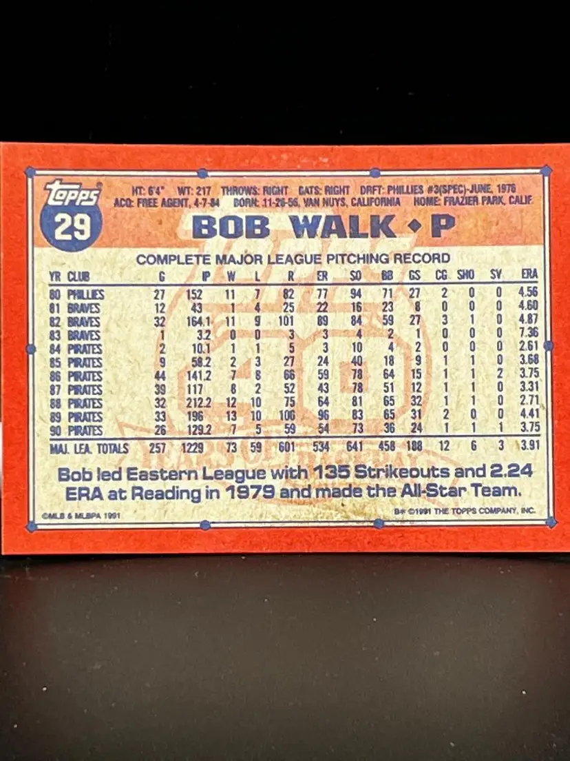 Hello, what we have is a Baseball Trading Card by: Topps. Year: 1991. Team: Pirates. Player: Bob Walk. Number: 29.