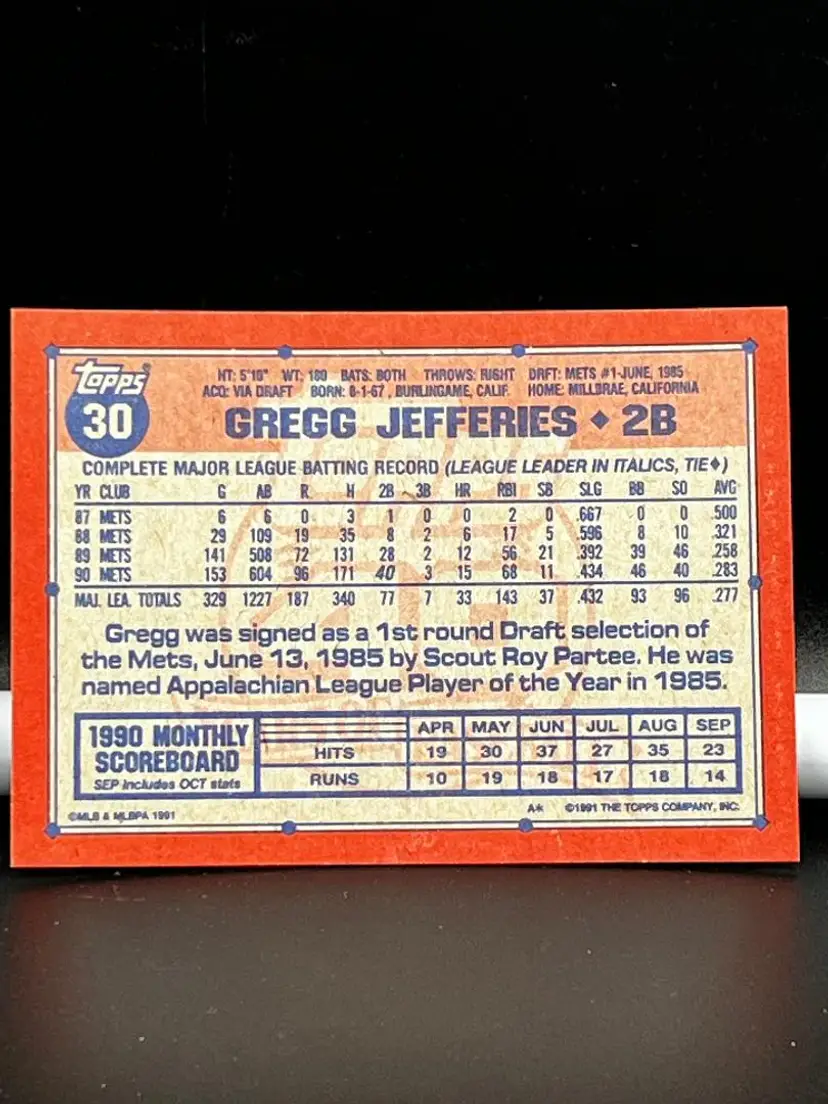 Hello, what we have is a Baseball Trading Card by: Topps. Year: 1991. Team: Mets. Player: Gregg Jefferies. Position: #30.