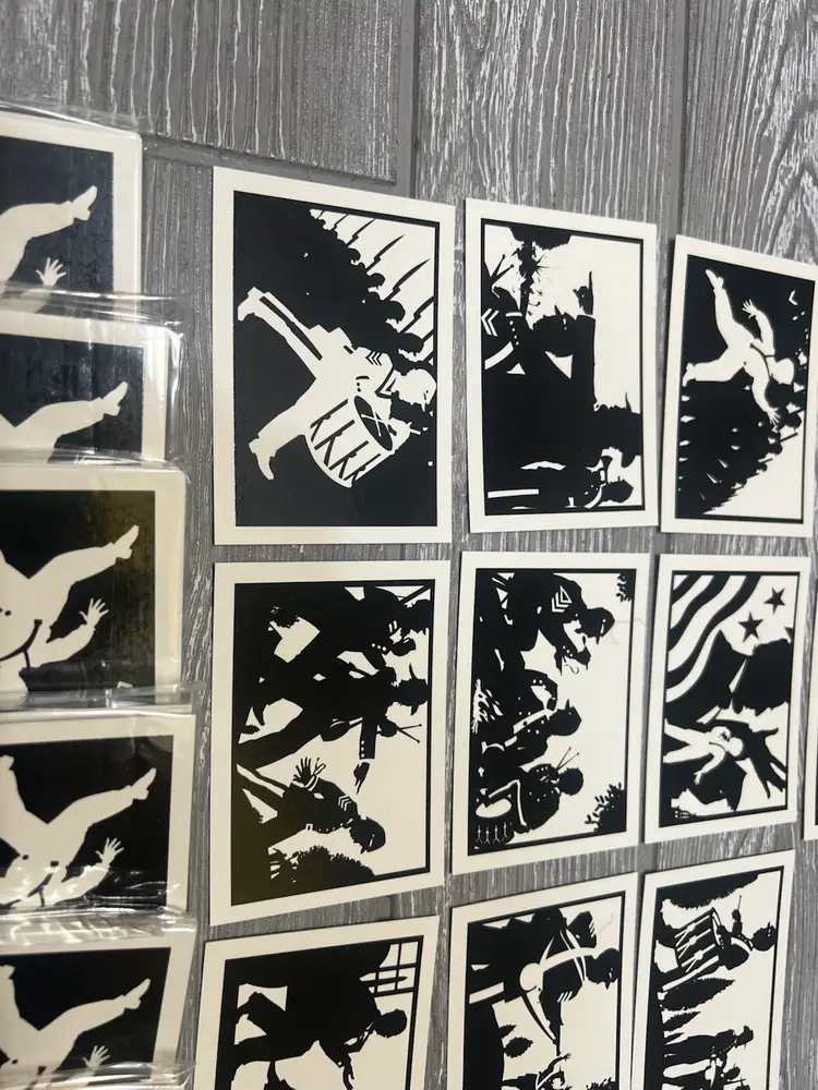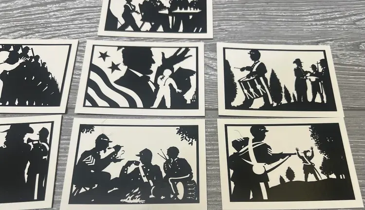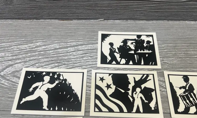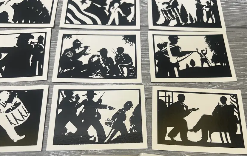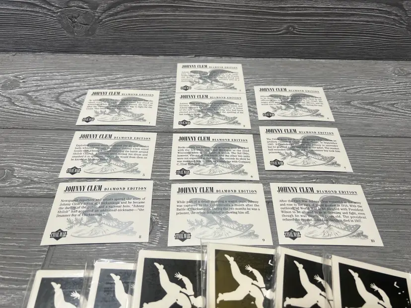 This unique 10-card set was produced by Tuff Stuff and released in late 1991. It was initially only available through authorized Tuff Stuff Product dealers. Deemed as the first silhouette card set ever produced, it features the young Civil War hero and drummer Johnny Clem in 10 different silhouette poses all created by renowned Silhouette artist Scott Wright. High quality and unique graphics make this special 10-card edition a rare collectible item. The reverse side of the cards feature the interesting story of one of the youngest soldiers in history to join the army at age 10 as a drummer boy and went on to retire as a Major General. No Civil War fan or collector should be without this set.