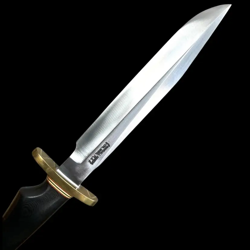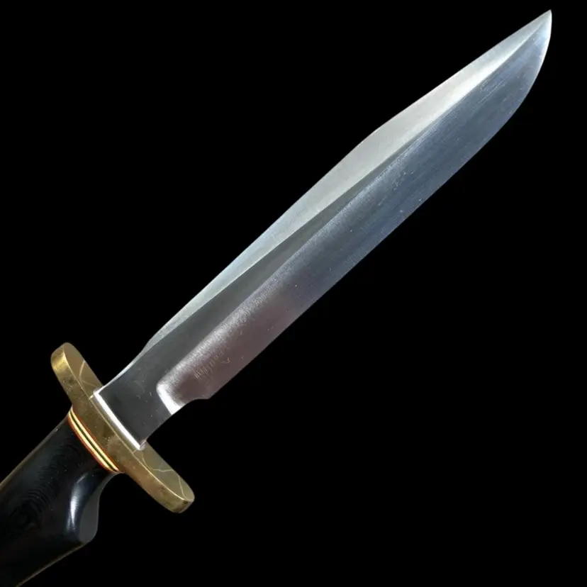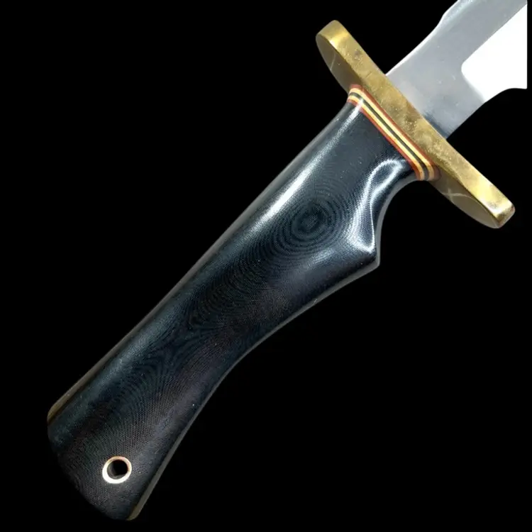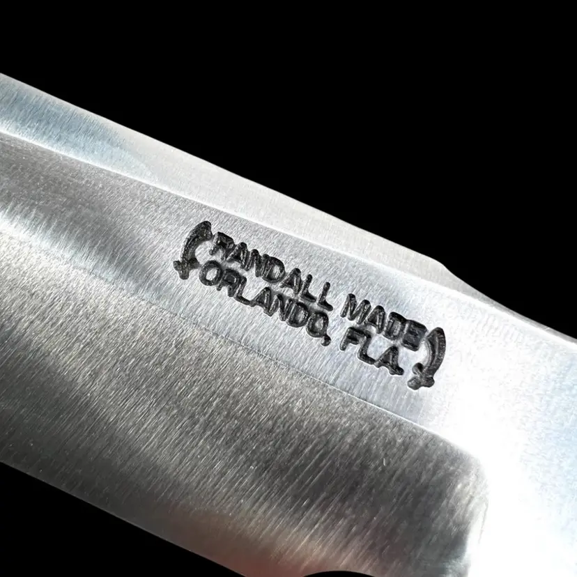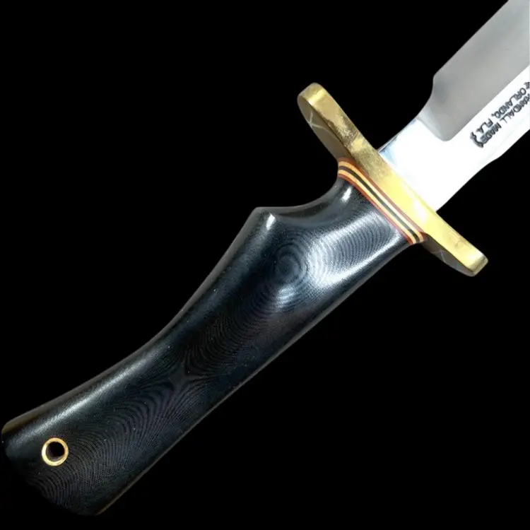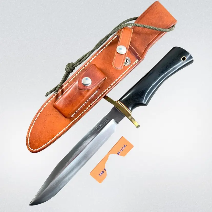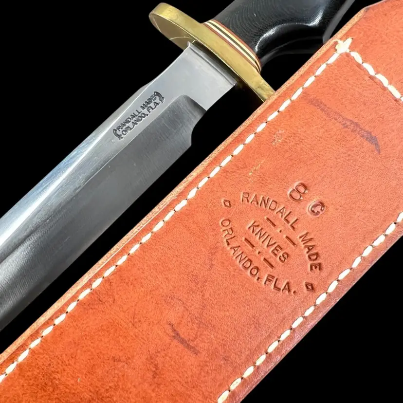 Highly Collectible Randall Knife. Knife style is Model #1. Age: 1991. Brass forward curve guard. Black micarta single finger grip with brass thong hole. Randall leather model C sheath with sharpening stone. 13" overall. 8" blade. Weighs 1 pound Condition: No issues knife or sheath