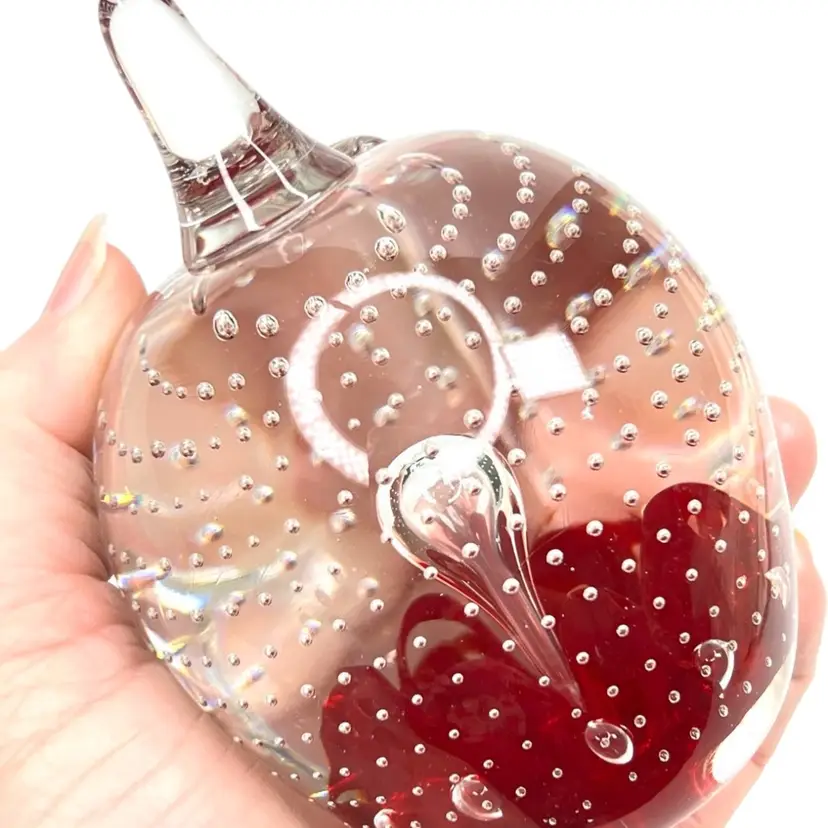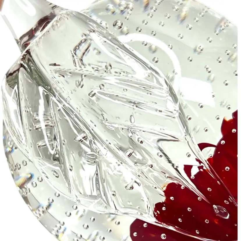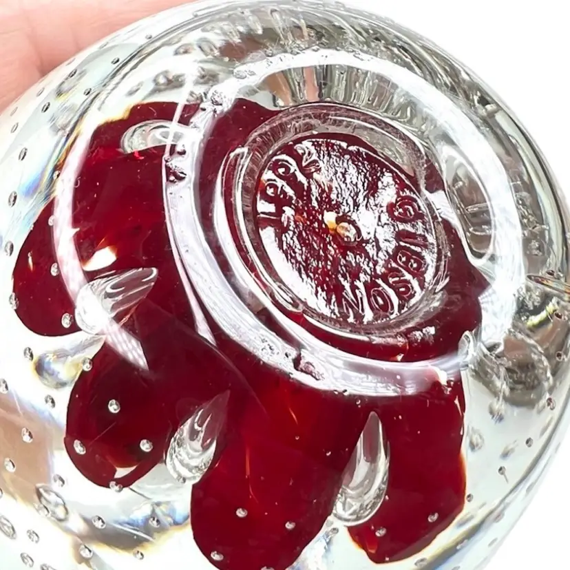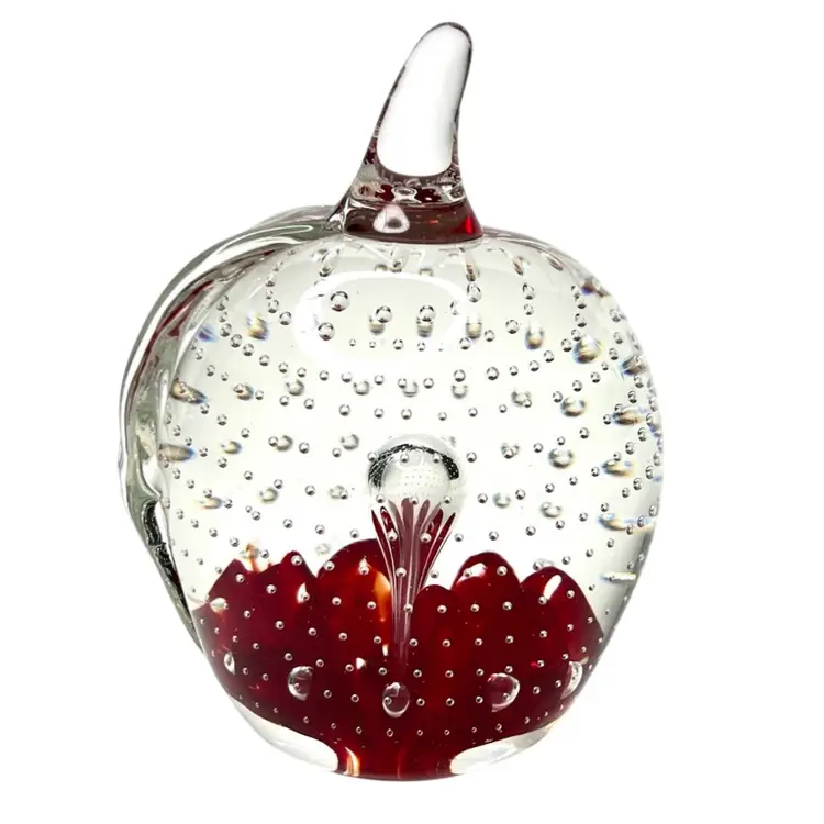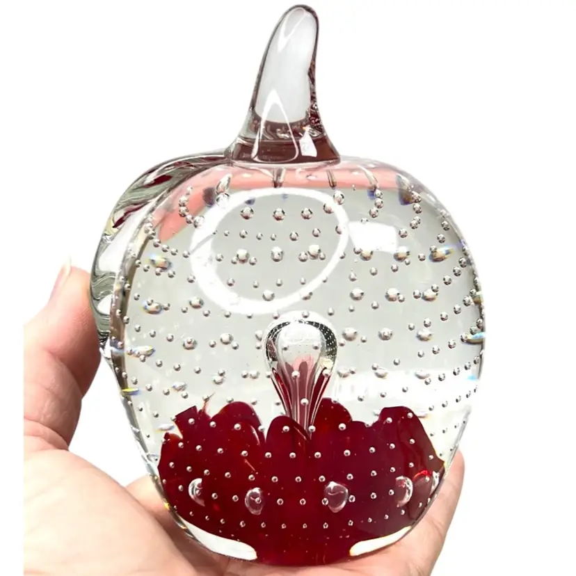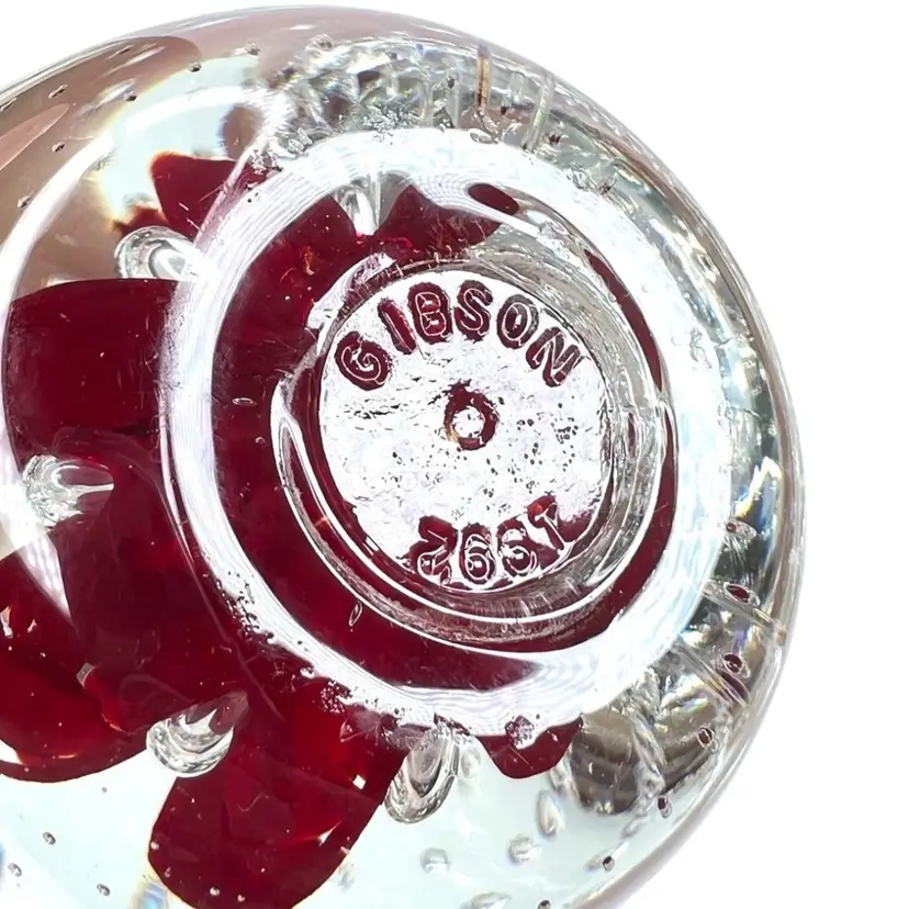 Beautiful clear glass apple 🍎 paperweight Clear stem ; clear petal on side Clear controlled bubbles Interior red “petals” Marked Gibson 1992 on bottom Weighs 1 pound 12 ounces! Size 4-1/2” tall x 3-1/4” wide Condition: No chips, no cracks, no scuffs