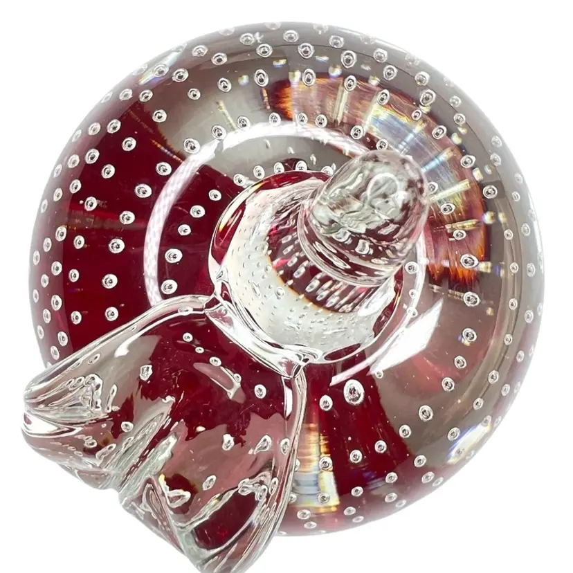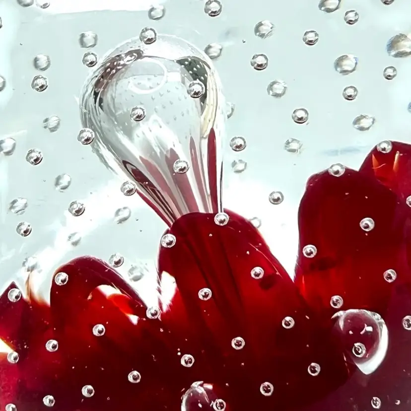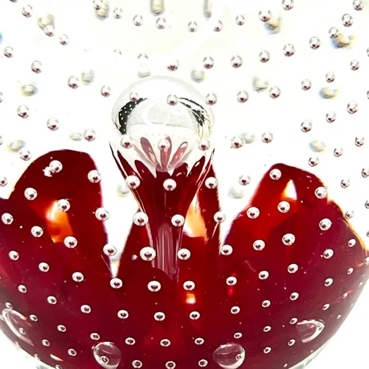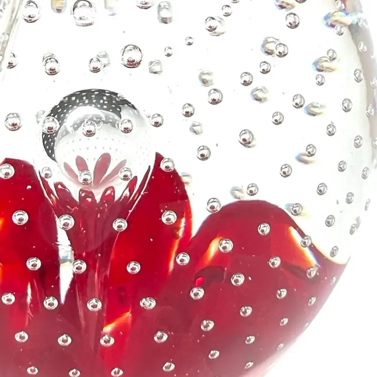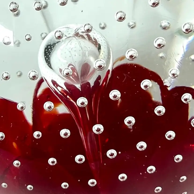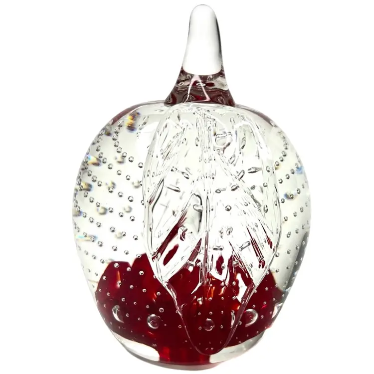 Beautiful clear glass apple 🍎 paperweight Clear stem ; clear petal on side Clear controlled bubbles Interior red “petals” Marked Gibson 1992 on bottom Weighs 1 pound 12 ounces! Size 4-1/2” tall x 3-1/4” wide Condition: No chips, no cracks, no scuffs