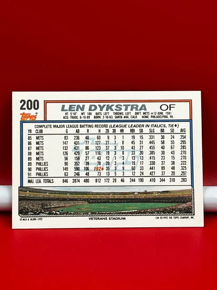 Hello, what we have is a Collector Baseball Card by: Topps. Year: 1992. Team: Phillies. Player: Len Dykstra. Number: 200.