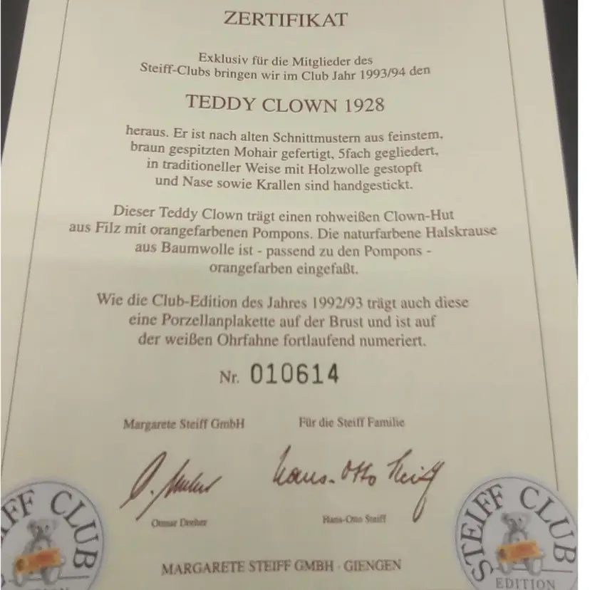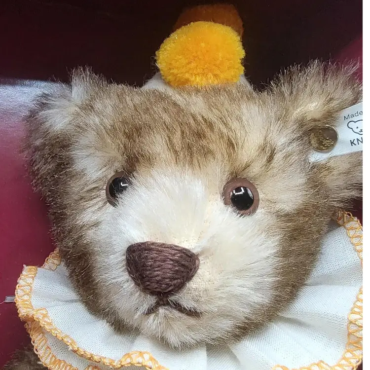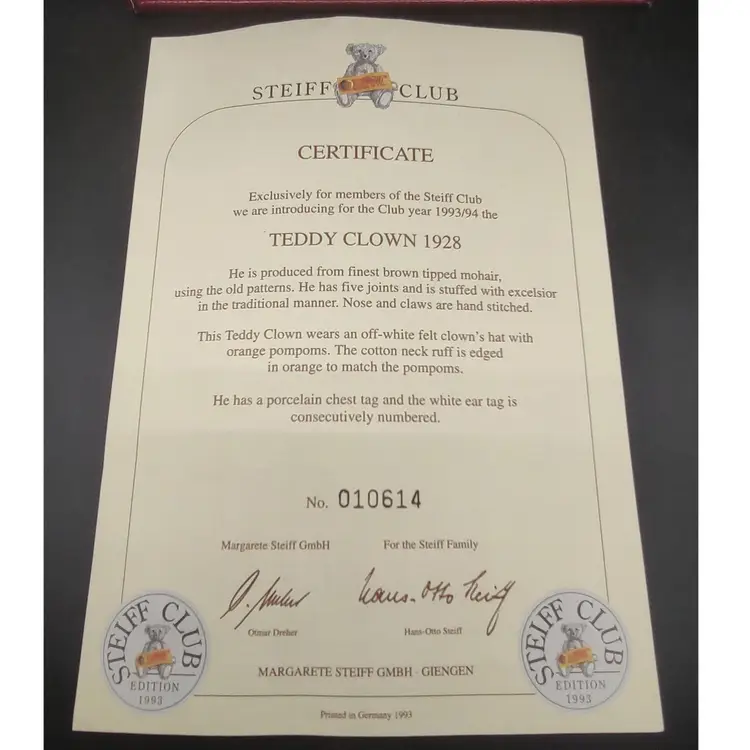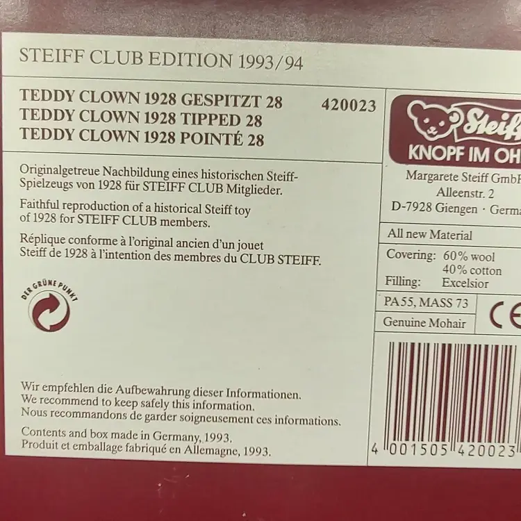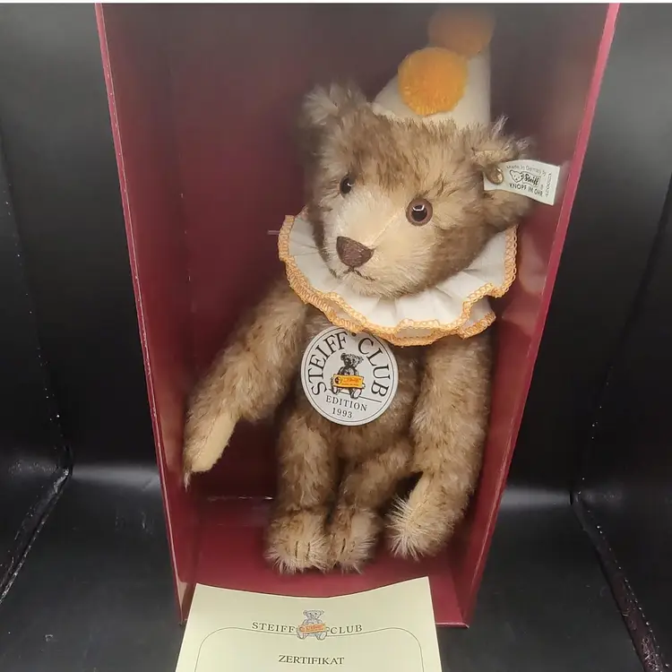 1993/1994 Steiff Club 12" Teddy Clown Plush Bear. Comes in the original box with tags and certificate, button ear, fully jointed,brown eyes and brown tipped mohair. Made in Germany
