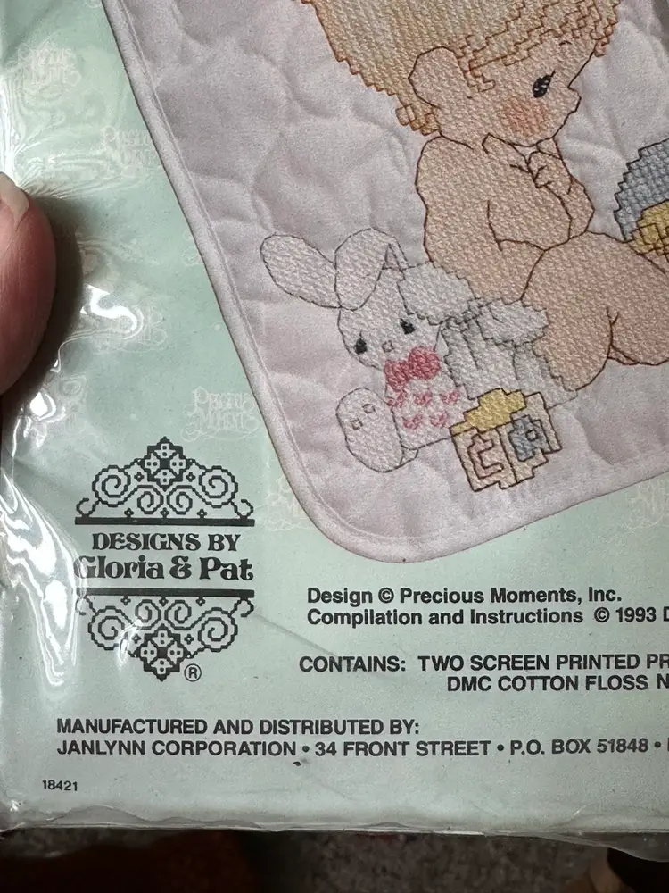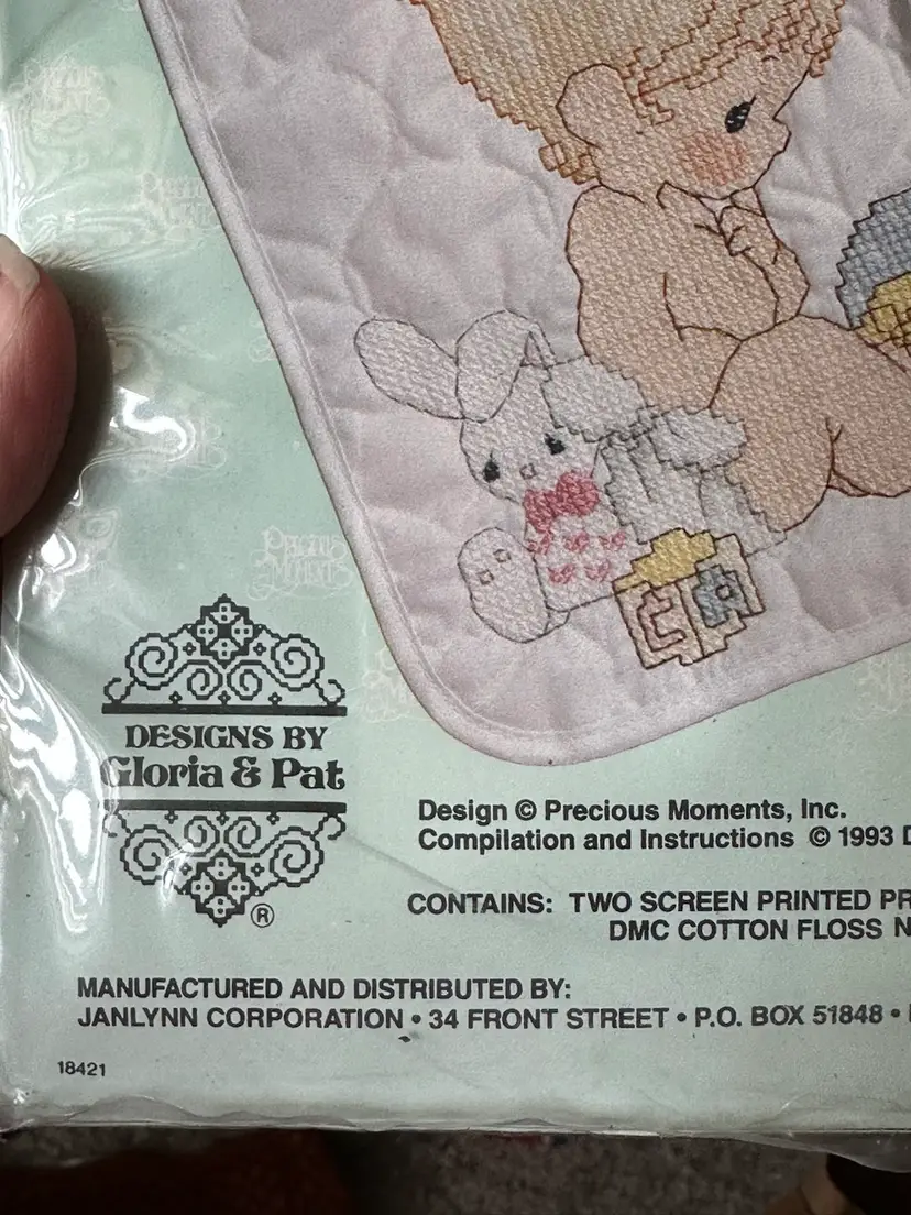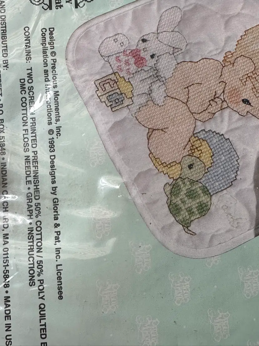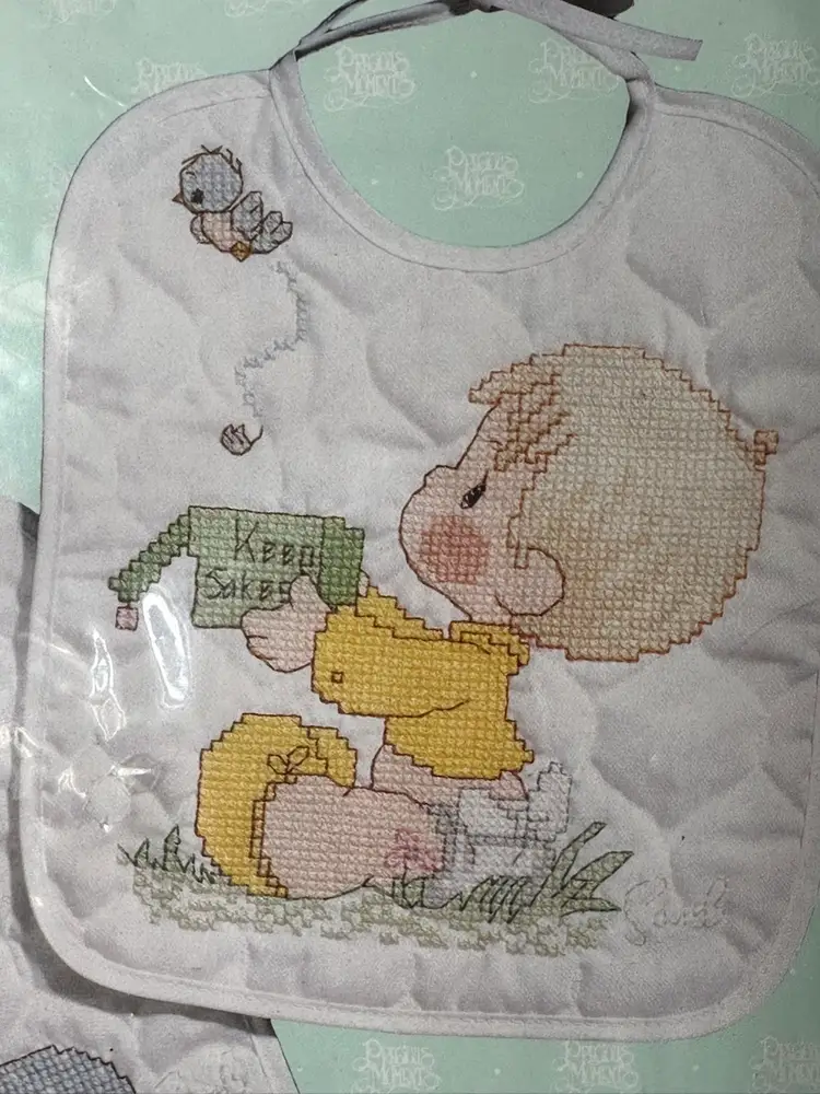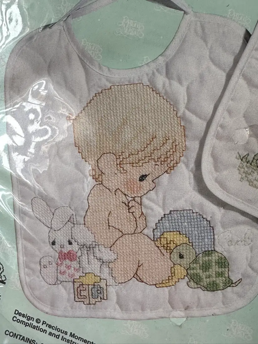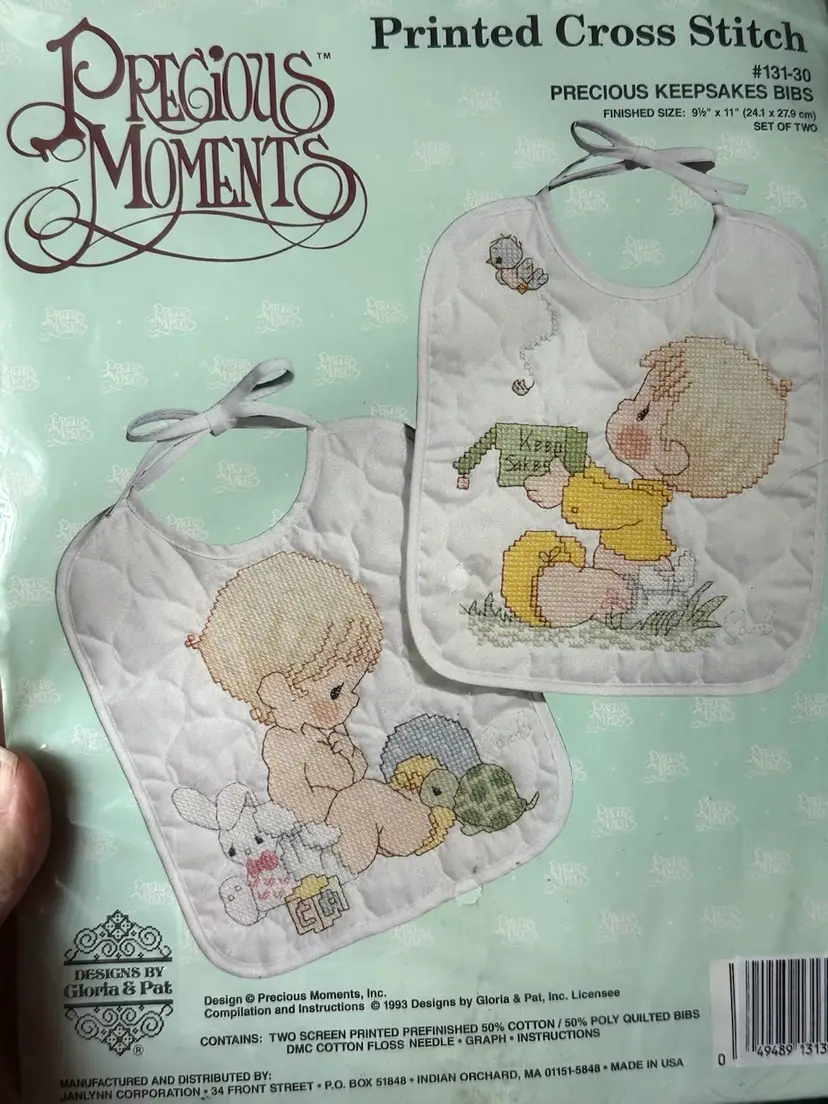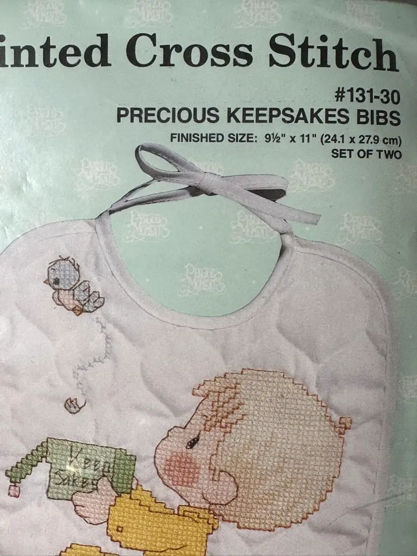 This 1993 Janlynn PRECIOUS MOMENTS KEEPSAKES BIBS Printed Cross Stitch KIT #131-30 is a perfect addition to your collection. The kit includes everything you need to create a beautiful set of two bibs, featuring the beloved Precious Moments characters. The design is printed on cross stitch quilted fabric, making it easy to create a stunning finished product.