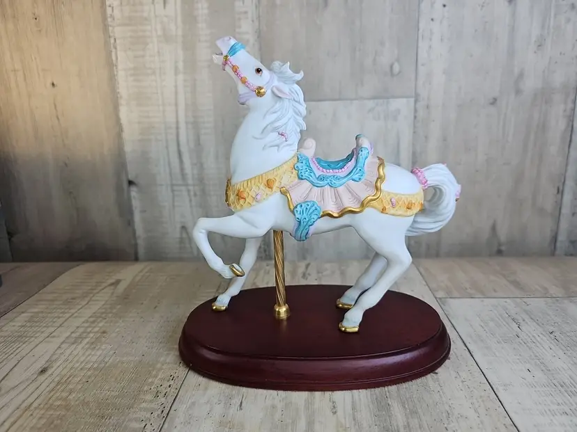 Beautiful Lenox carousel horse featuring a coastal sea shell motif design. This 1993 edition showcases pastel tones, shell and ocean-inspired detailing, gold accents, and elegant sculpted movement. 3431