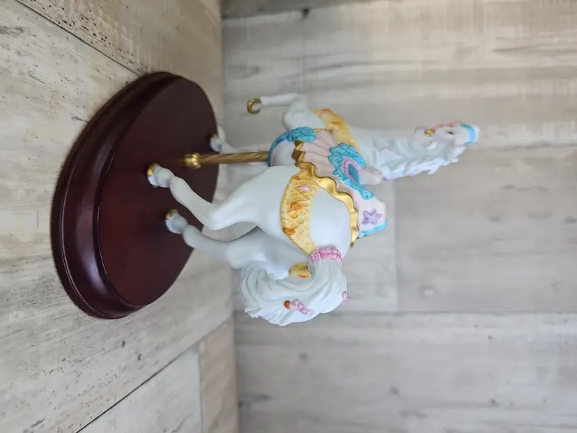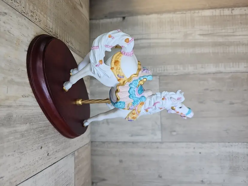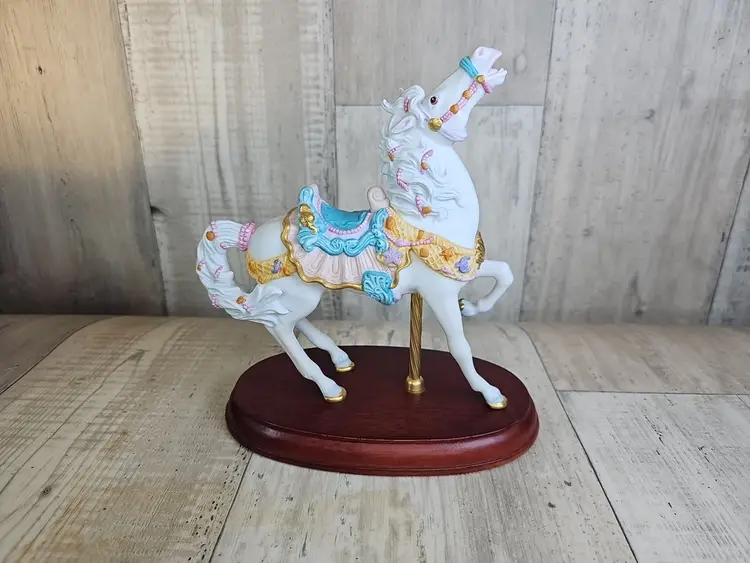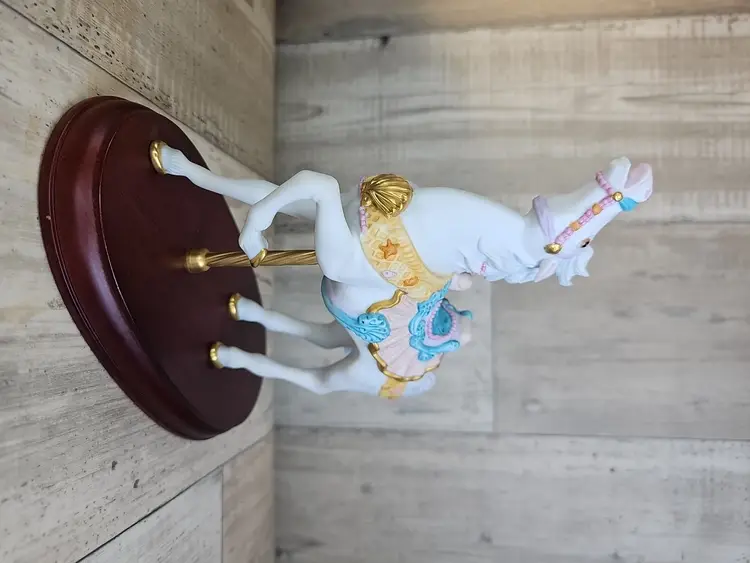 Crafted in fine porcelain and mounted on its original oval wood-tone base with brass carousel pole.