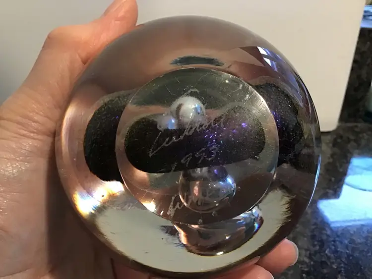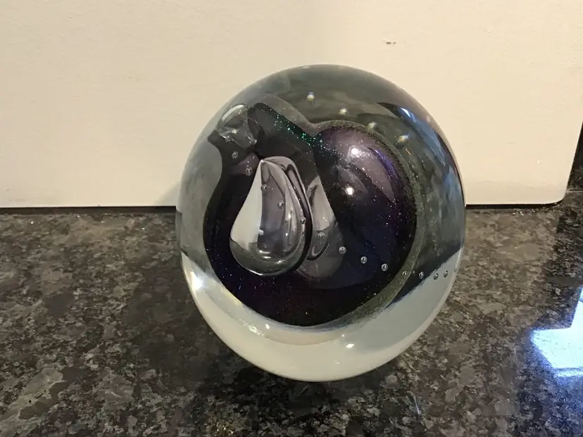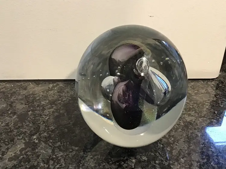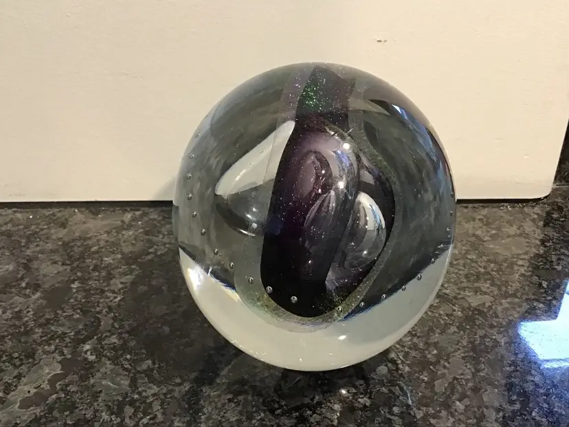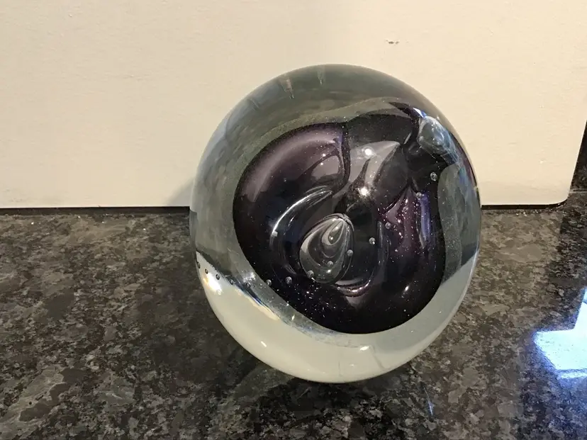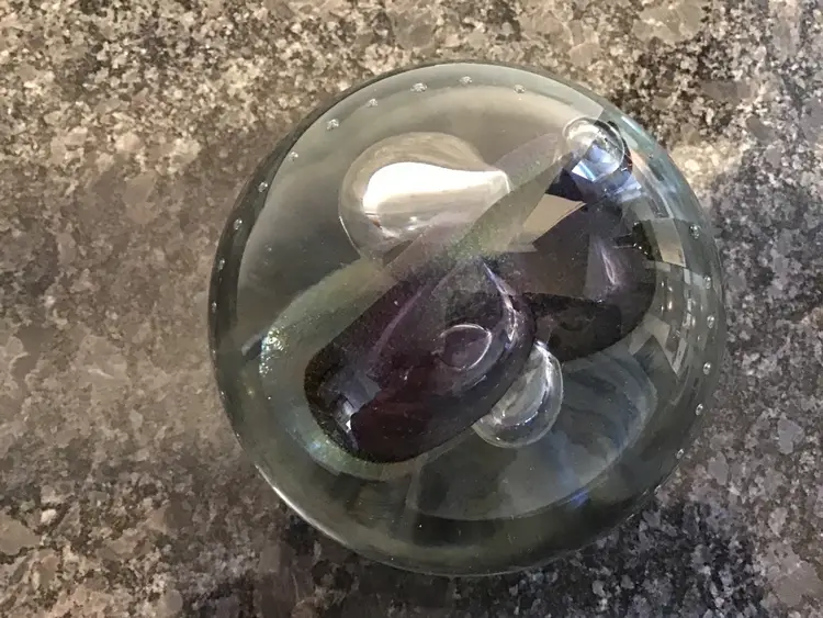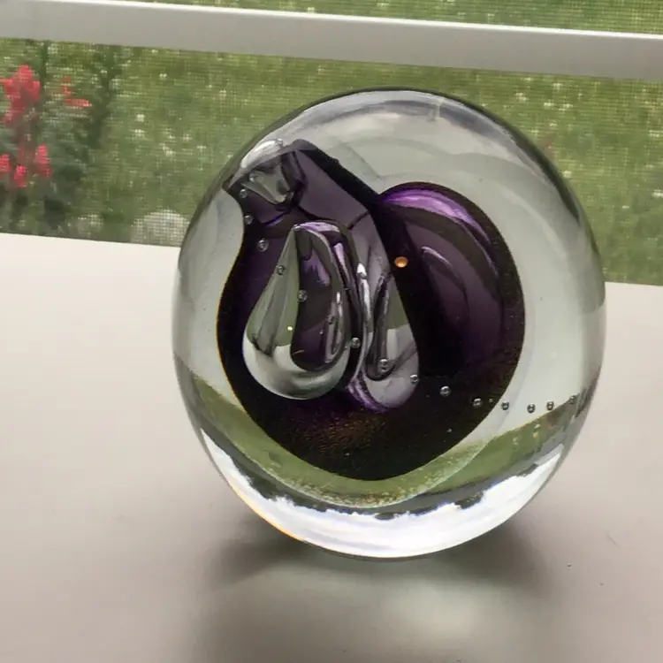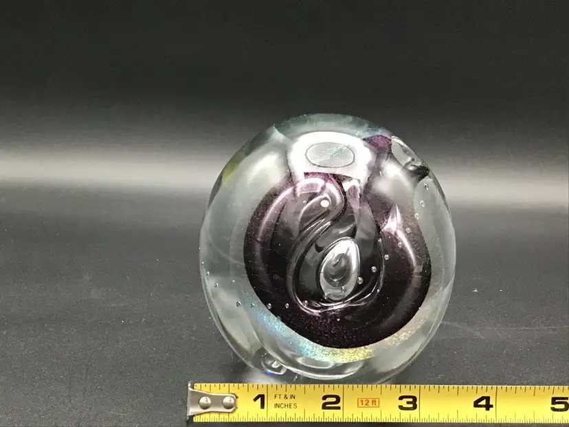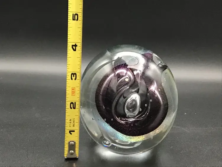 This lives find a cool paper weight is 4 inches tall and 3 1/2 inches across. It is a gorgeous, clear paperweight with control bubbles, purple abstract center with bubbles and iridescence. This paper weight is an excellent condition with no chips, cracks or flea bites. Please see pictures for complete description, measurements and condition