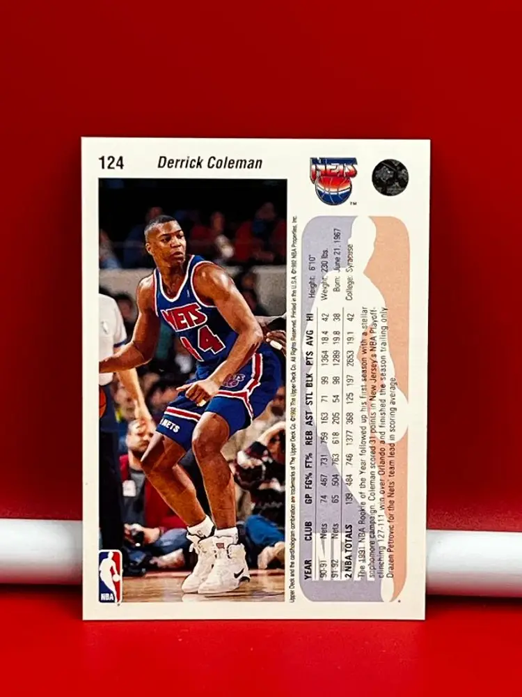 Hello, what we have is a Collector Trading Card by: Upper Deck. Year: 1993. Team: Nets. Sport: Basketball. Player: Derrick Coleman. Number: 124.