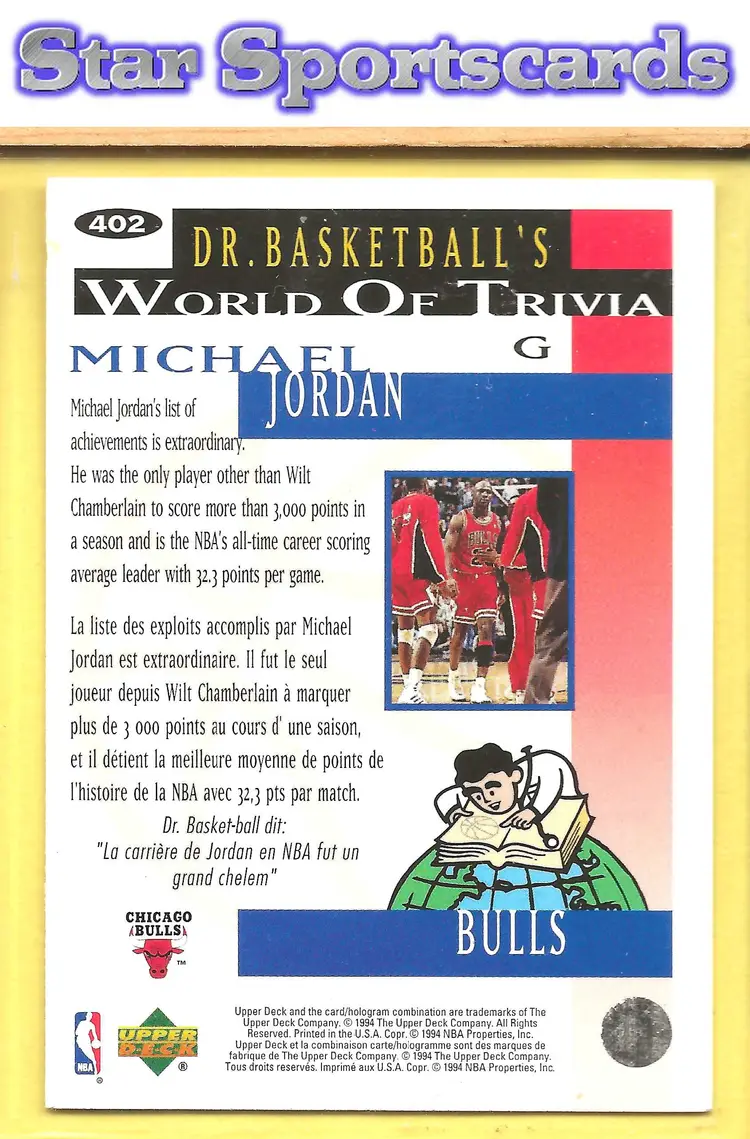 This is a nice example of a 1994-95 Collector's Choice French #402 Michael Jordan .Other important information about this card: In Michael Jordan played for the Chicago Bulls.Please check out our other listings for more great cards.