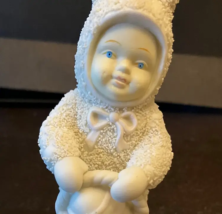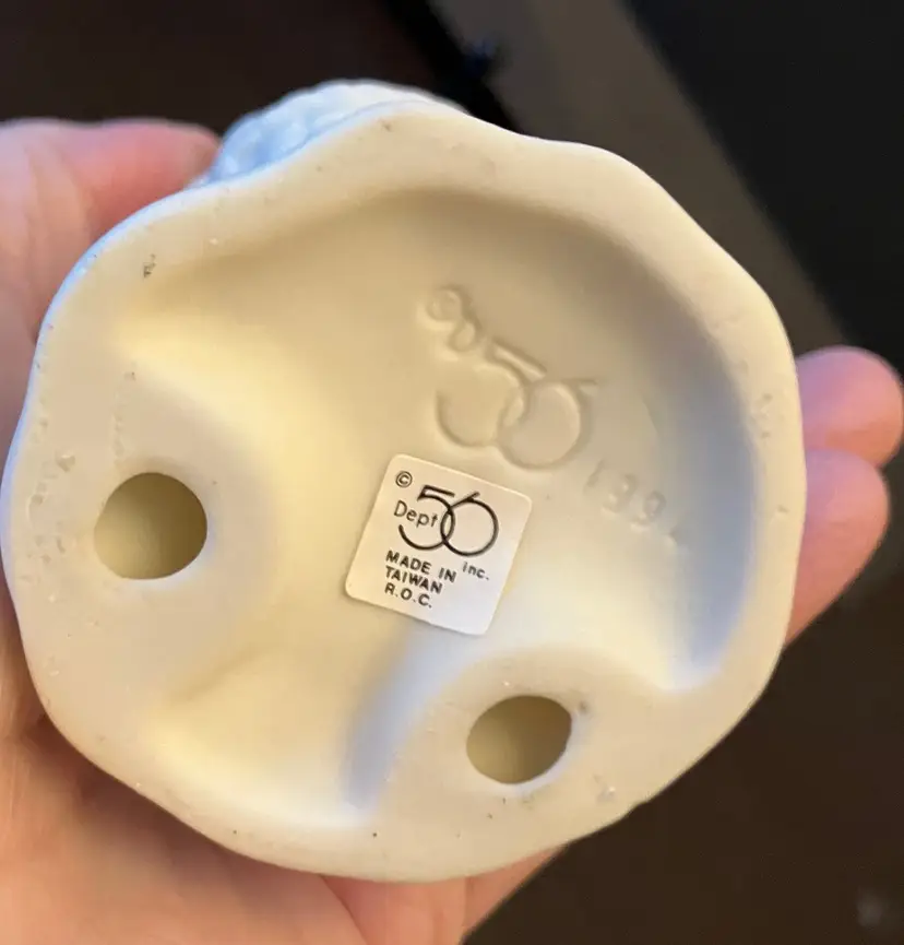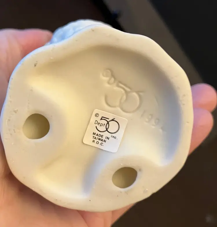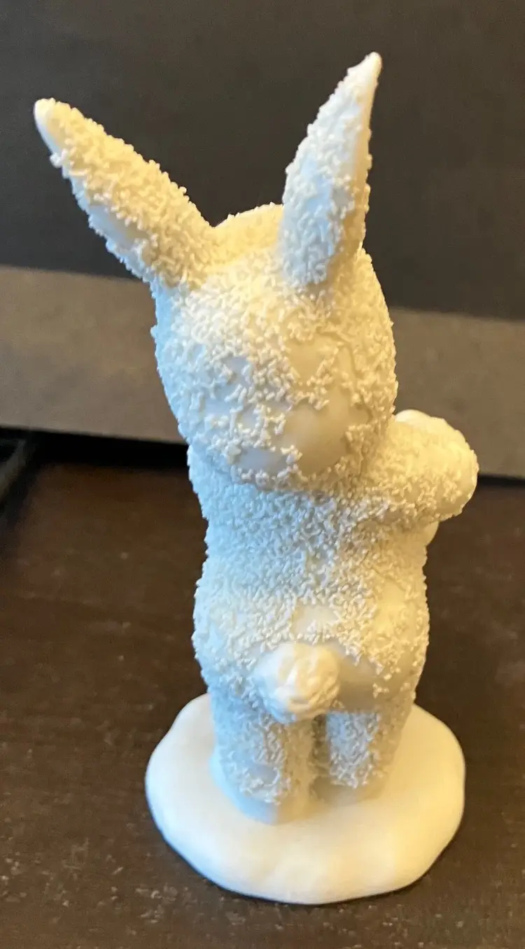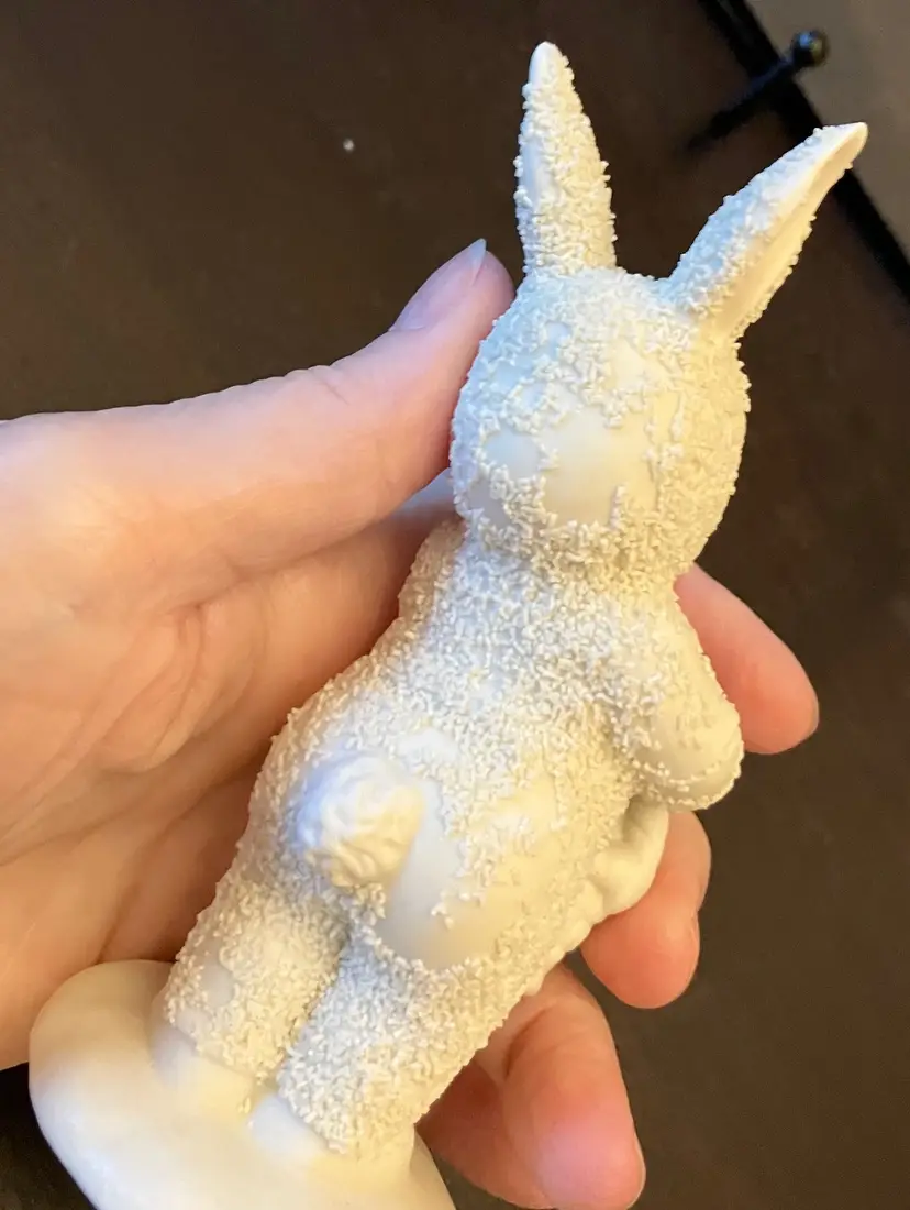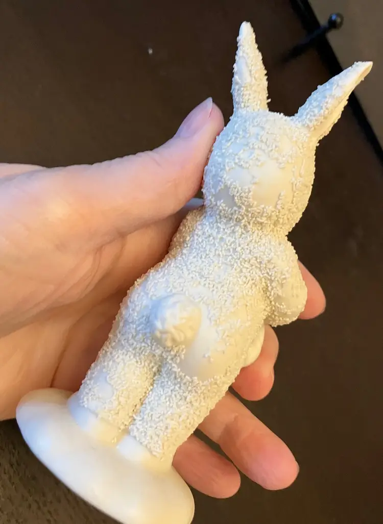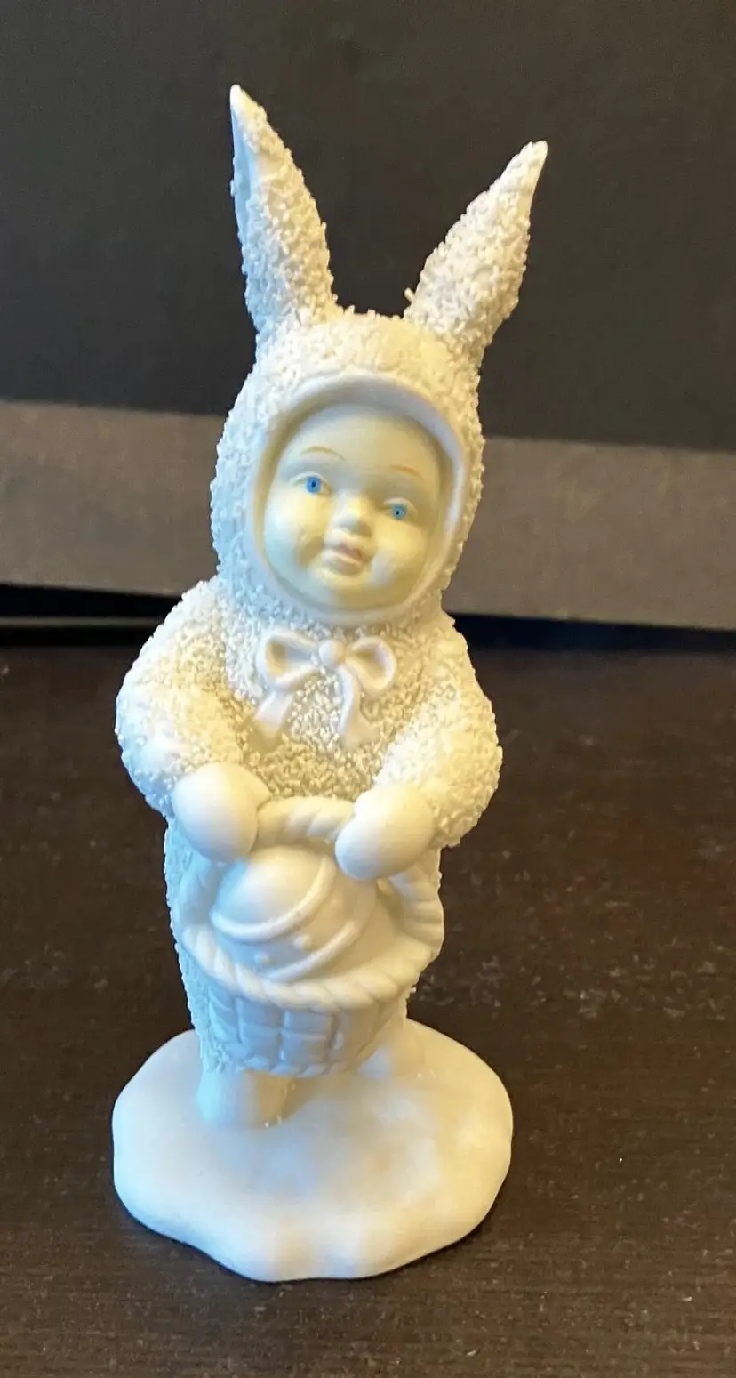 Handpainted face with blue eyes and bunny ears, holding an Easter basket. Texture has worn off several areas, the back of the head, bottom, right and left arm. Dimensions: 5" by 2" wide.