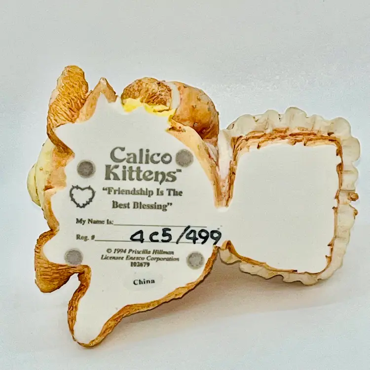 This is a 1994 Enesco Calico Kittens Friendship is the Best Blessing 102679 Figurine.
