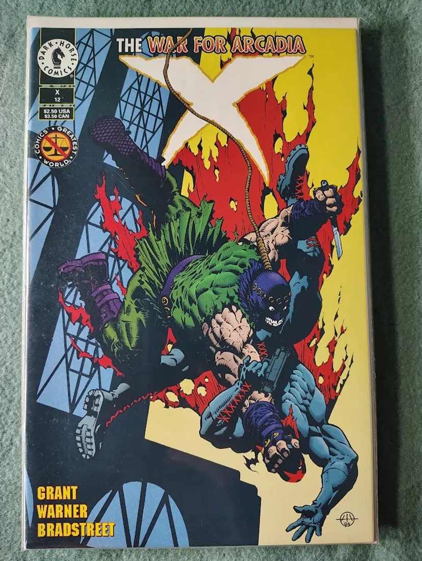 This 1994 Dark Horse Comics comic depicts two muscular characters locked in an aerial battle, one suspended by a rope, against a backdrop of flames and a geometric pattern. A 1994 Modern Age from the spinner rack days, this comic has been waiting for the right collector. Bagged and boarded since the 90s, this comic has been waiting for the right collector.
