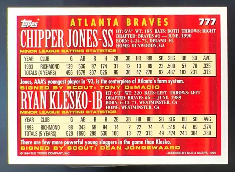 1994 Topps Baseball Chipper Jones Ryan Klesko Gold #777 RC Atlanta Braves