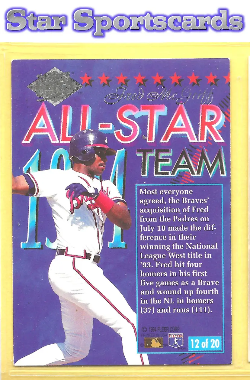 This is a nice example of a 1994 Ultra #12 Fred McGriff Ultra All-Star Team .Other important information about this card: In Fred McGriff played for the Atlanta Braves.Please check out our other listings for more great cards.