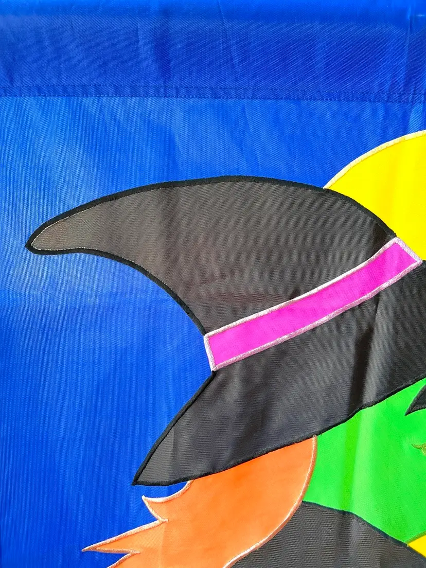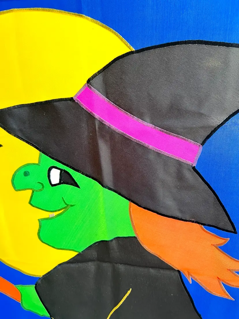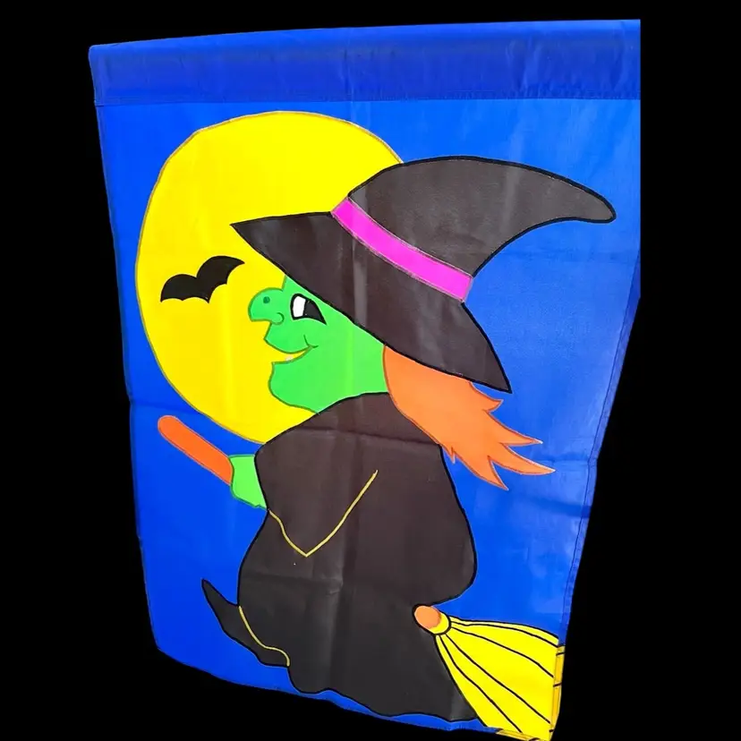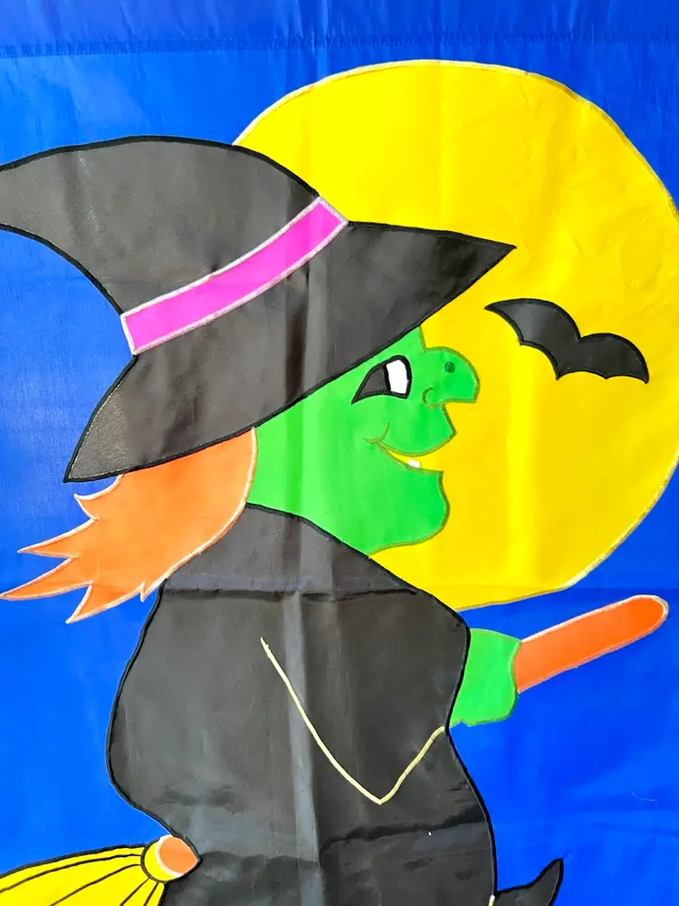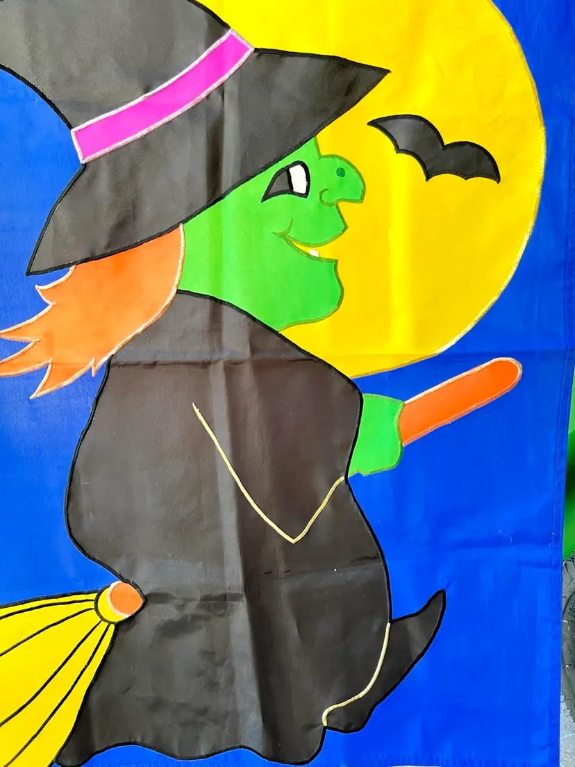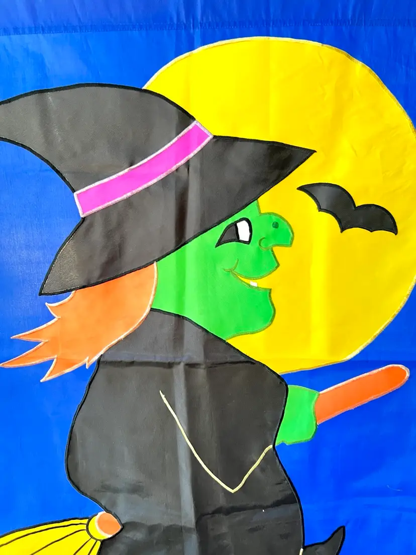 Youβll go just batty at this decorative flag! Cackle & howl with delight watching the vintage beauty fly! 1994 Witch On Broom Moon π & Bat π¦ in background Halloween Garden Flag Manufacturer Tag- Artistic Flags 100% Nylon 28-1/2β X 39-1/2β Nice 2β reinforced opening for flag pole Condition: Excellent! Bright bold color. No rips, tears, stains. It has been folded so there will be creases.