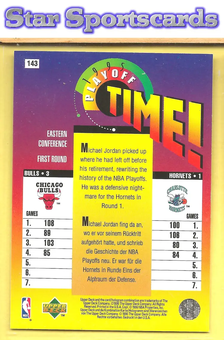 This is a nice example of a 1995-96 Collector's Choice German II #143 Michael Jordan .Other important information about this card: In Michael Jordan played for the Chicago Bulls.Please check out our other listings for more great cards.