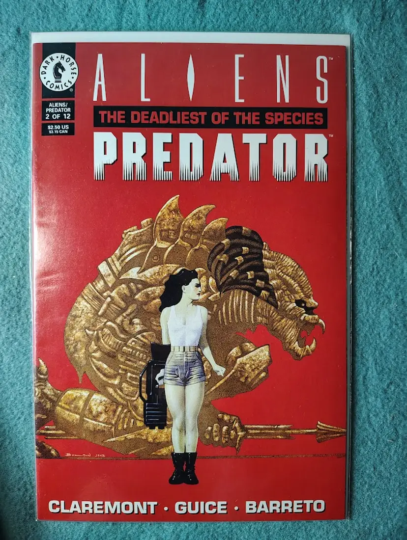 This 1995 Dark Horse Comics comic displays a woman in shorts standing in front of a large, golden Predator head on a red background. This Modern Age comic brings back memories of browsing through comic shops, searching for the next exciting installment. Bagged and boarded since the 90s, this comic has been waiting for the right collector.