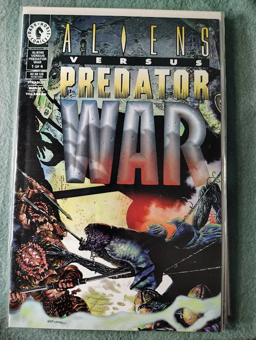 This 1995 Dark Horse Comics comic features a dynamic cover depicting an Alien and a Predator engaged in a fierce battle, with the "WAR" logo prominently displayed. The cover art captures the intense conflict between these iconic creatures, set against a backdrop of destruction and chaos. SKU: 12MAIN4-017