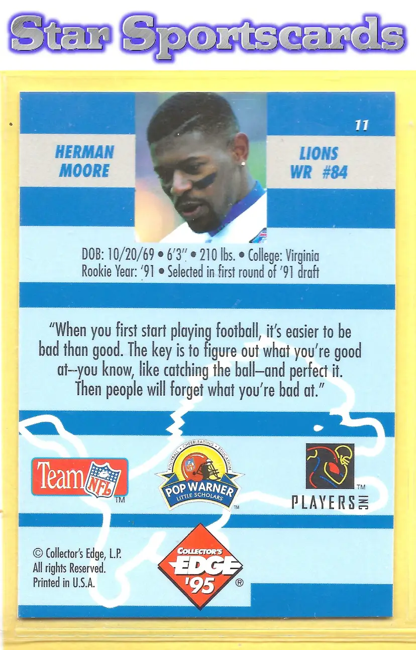 This is a nice example of a 1995 Collector's Edge Instant Replay #11 Herman Moore Prisms .Other important information about this card: In Herman Moore played for the Detroit Lions.Please check out our other listings for more great cards.