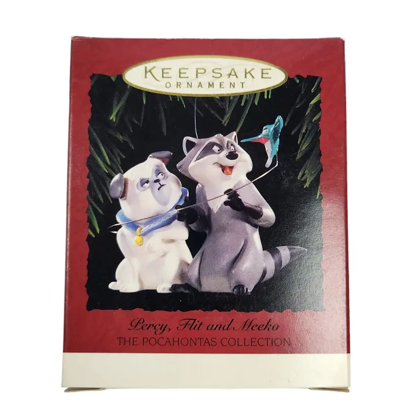 1995 Hallmark Percy Flit & Meeko Disney The Pocahontas Collection Keepsake Ornament IOB QXI6179 Step into the enchanting world of Disney's Pocahontas with this handcrafted Hallmark Keepsake Ornament. Featuring Percy, Flit, and Meeko, this 1995 collectible captures the beloved characters in delightful detail.