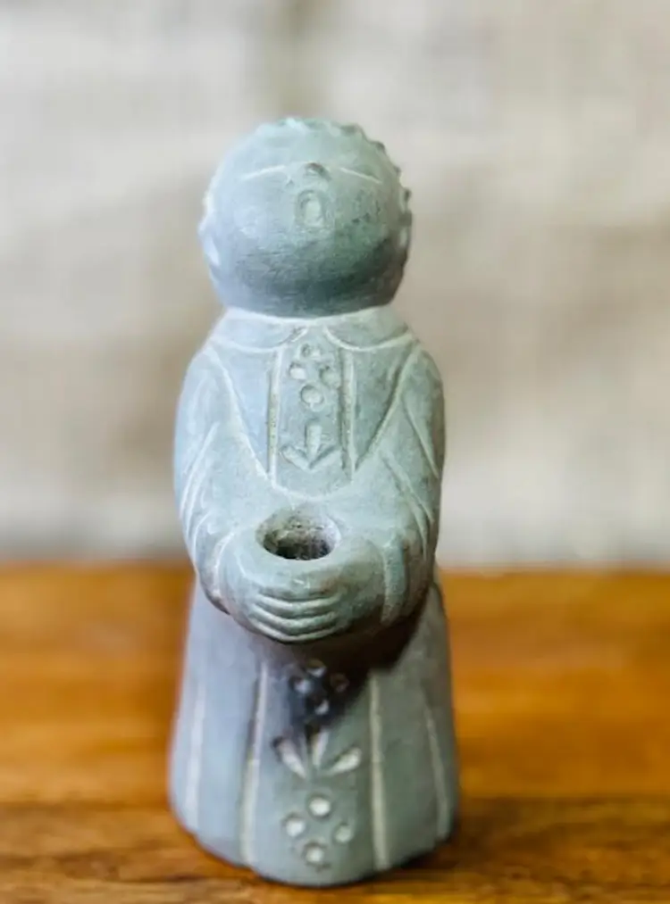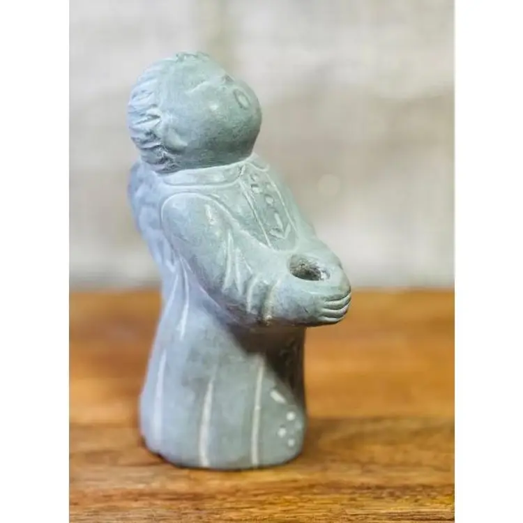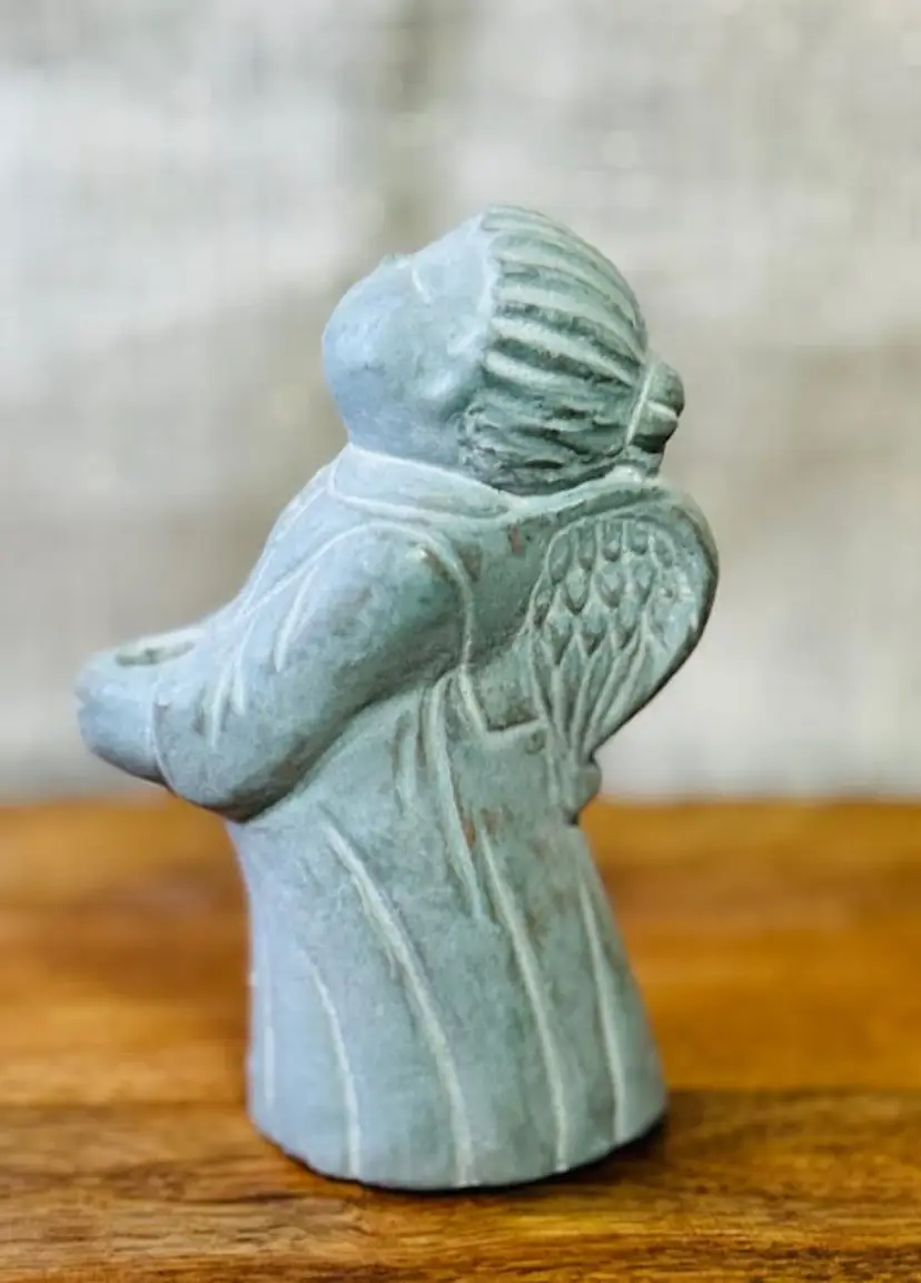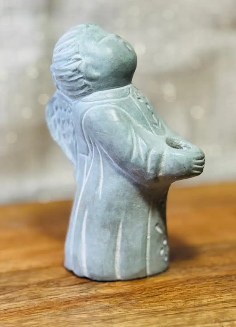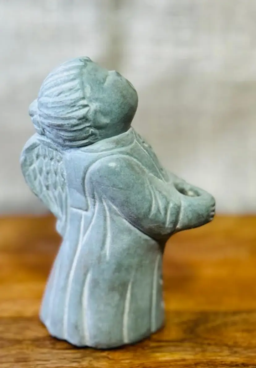The piece depicts an Inuit angel sitting atop a candle holder, with intricate details on the stone material. The sculpture stands at 7 inches tall and measures 6 inches in length and 4 inches in width.The item was produced in 1995 and is an original piece, not a licensed reproduction.