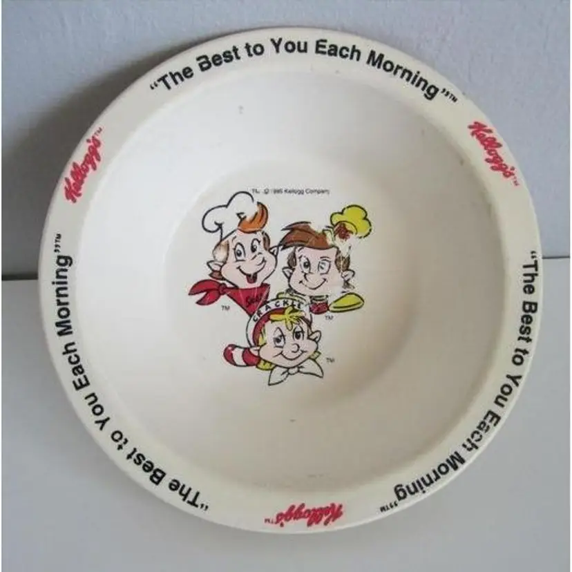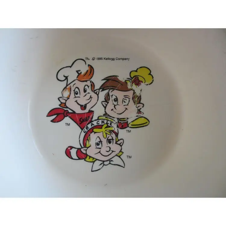 1995 Kellogg Company Rice Krispies Crackle Snap Pop cereal bowl. The bowl is melamine and measures 6 1/4" across and 2" high. There is wear to the bottom from the spoon use. It is dishwasher upper rack safe.