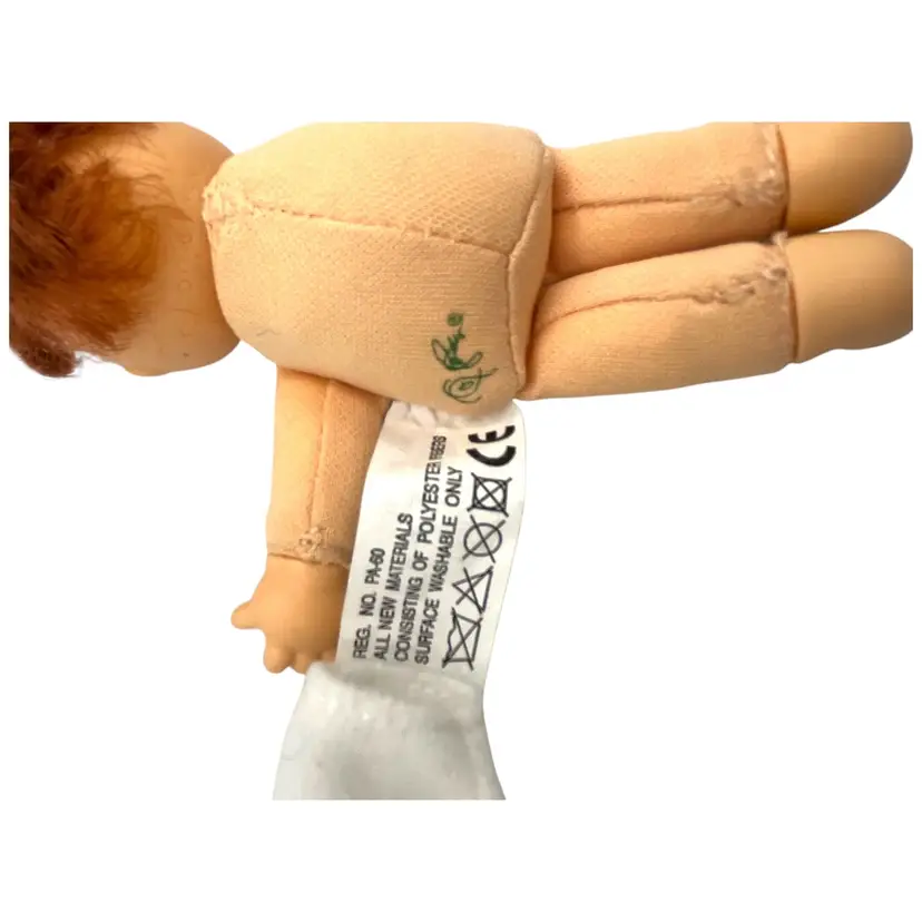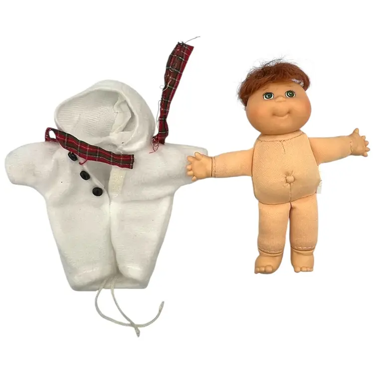 Vintage 1995 Mini Cabbage Patch Kids holiday-themed doll by Mattel. This adorable plush-body doll has a vinyl head and hands, green eyes, and auburn hair. Dressed in a snowman-inspired fleece coat with black buttons and a red plaid scarf.