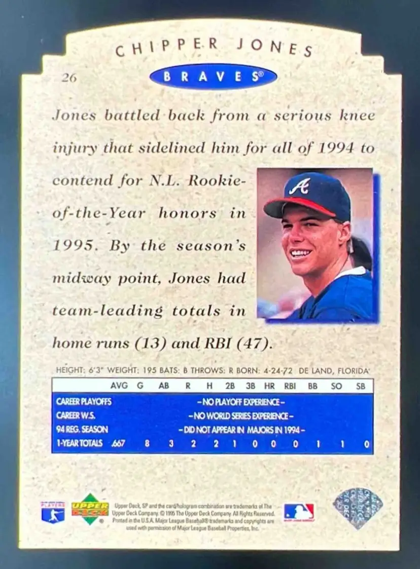 1995 SP Baseball Championship Chipper Jones Die Cuts #26 Atlanta Braves