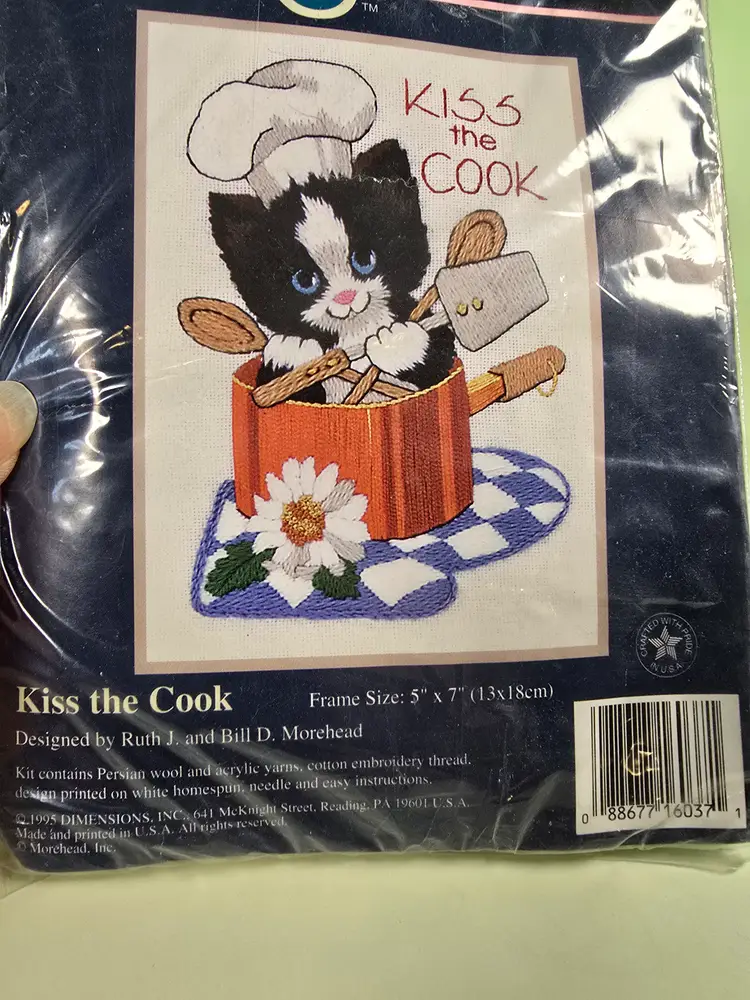 Adorable Sunset new old stock crewel kit seating a black and white cat. "Kiss the Cook". It is 5" x 7" when completed. Never been opened.