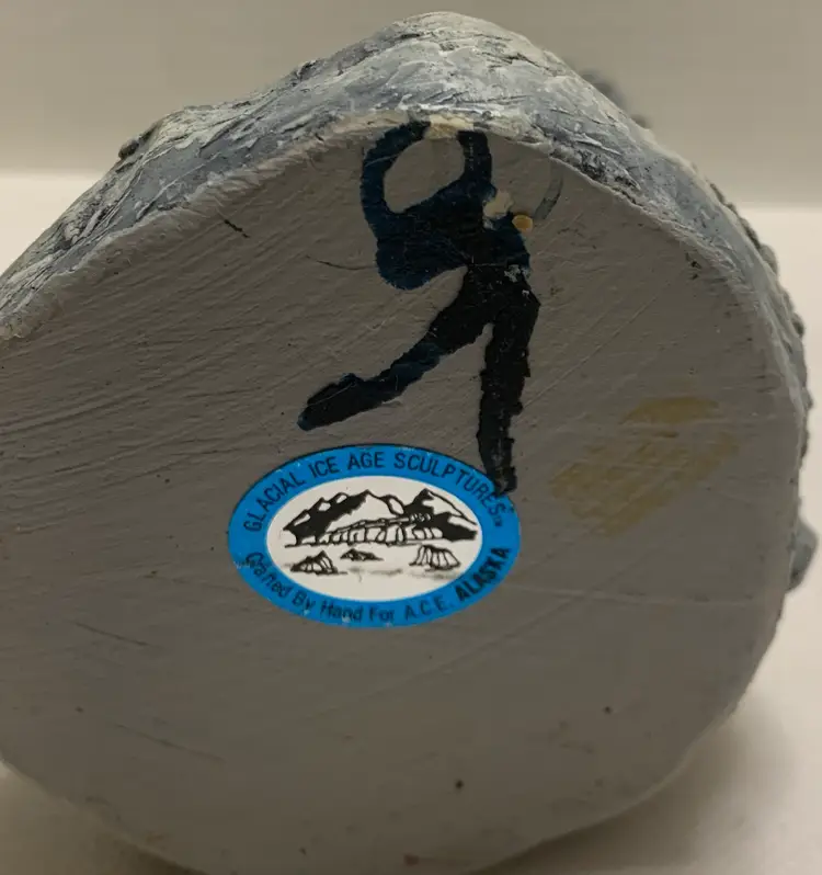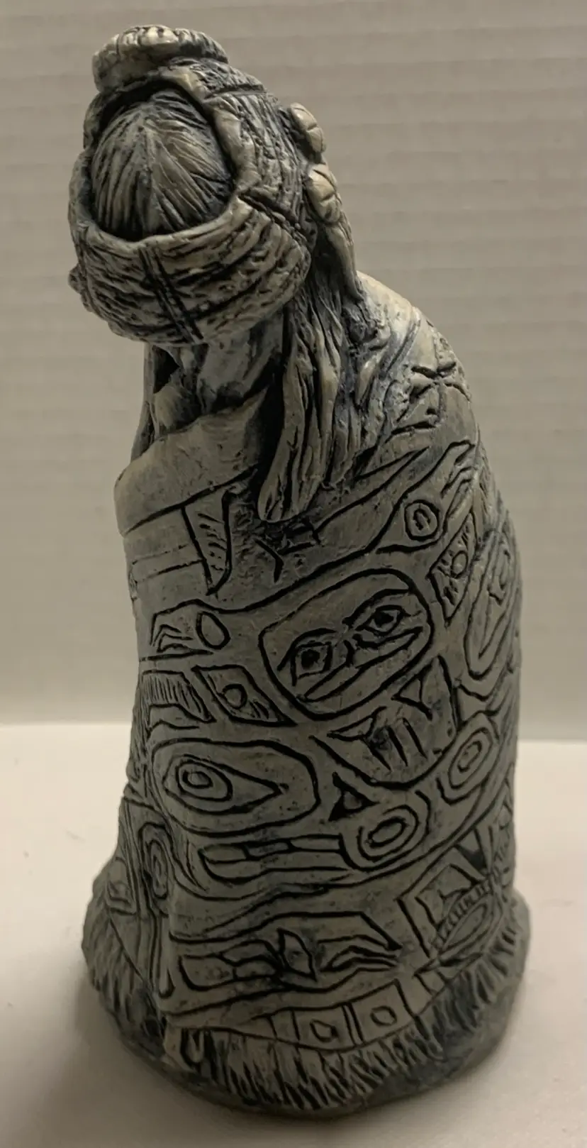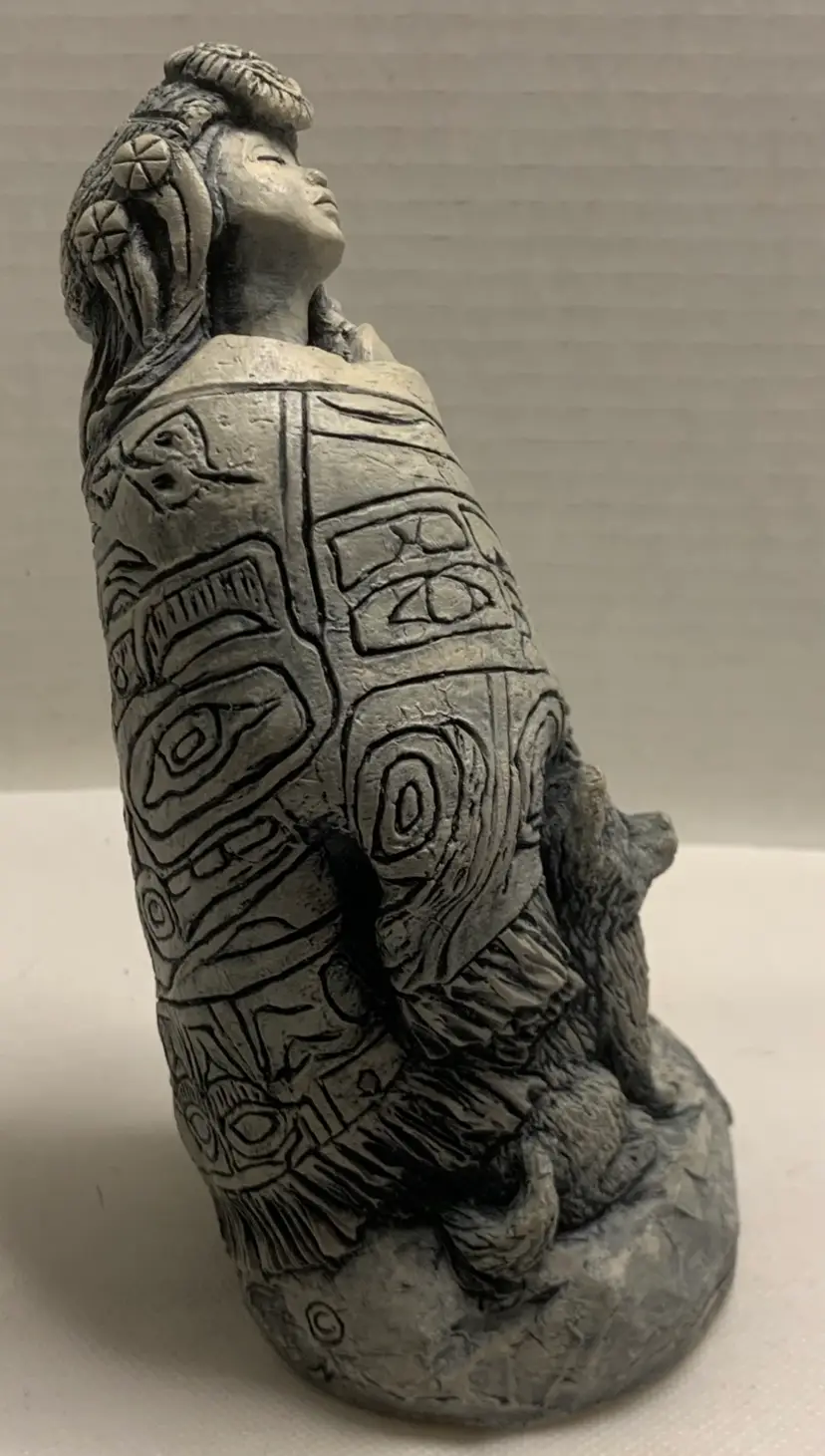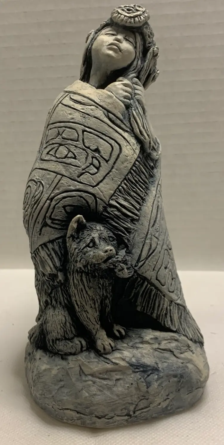 Woman in headgear braiding her hair, wrapped in a blanket with native symbols and her dog. Made of some kind of stone and believed to be a Ketchikan figure. Handcrafted for A.C.E. Alaska. 7.5” tall and 3.5” wide.