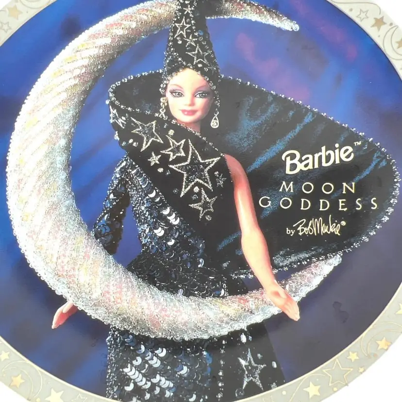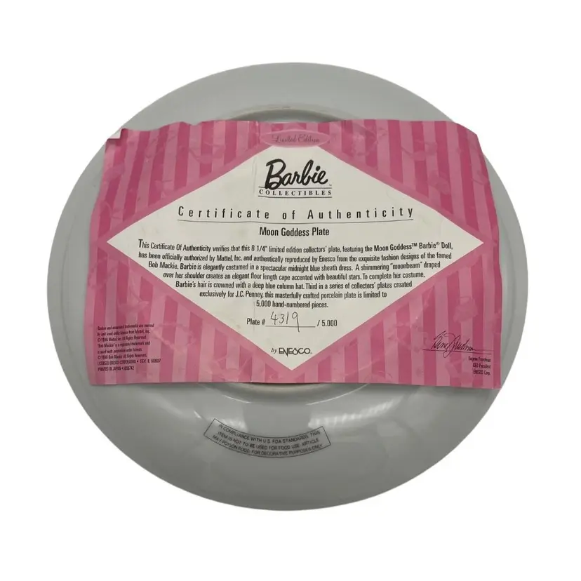 1996 Barbie Moon Goddess collectible plate from Enesco. Designed by Bob Markie. Limited edition 4319 of 5000. The plate measures approximately 8" across.