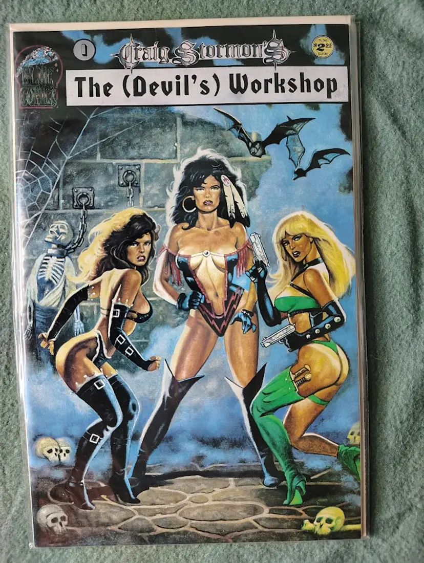 This 1996 Sirius comic, Craig Stormon's The (Devil's) Workshop #0, showcases three women in revealing outfits, armed with guns, surrounded by skulls and bats in a dungeon-like setting. This issue evokes the mid-90s era of independent comics, a time when new publishers and creators explored diverse themes and art styles.