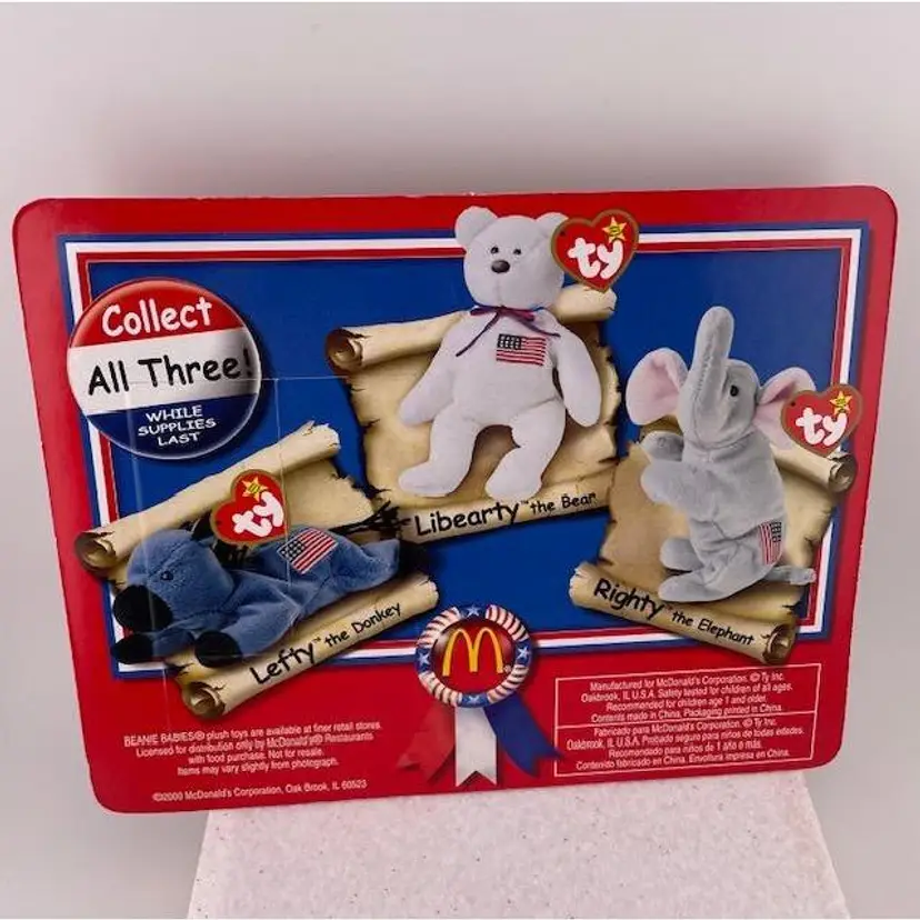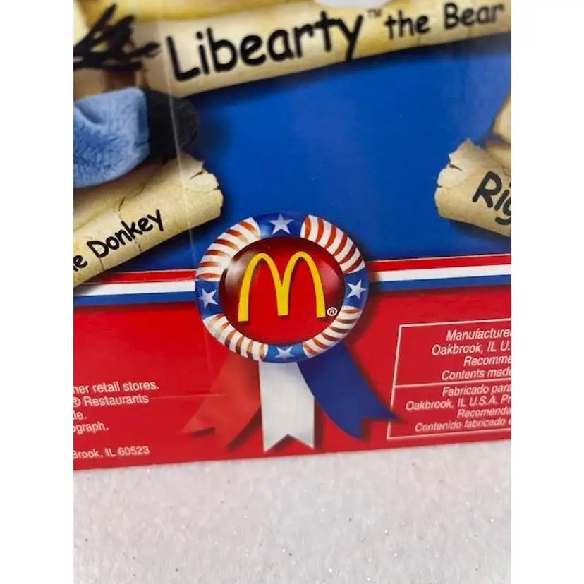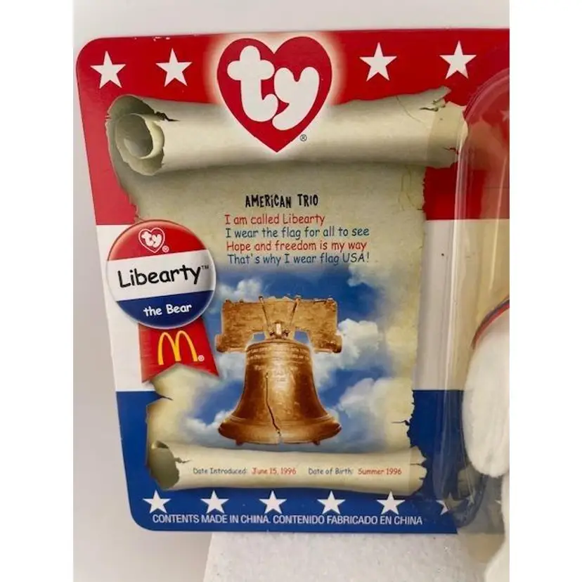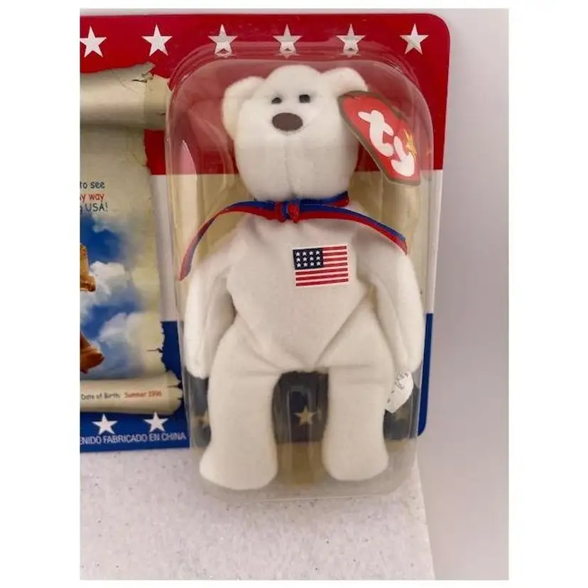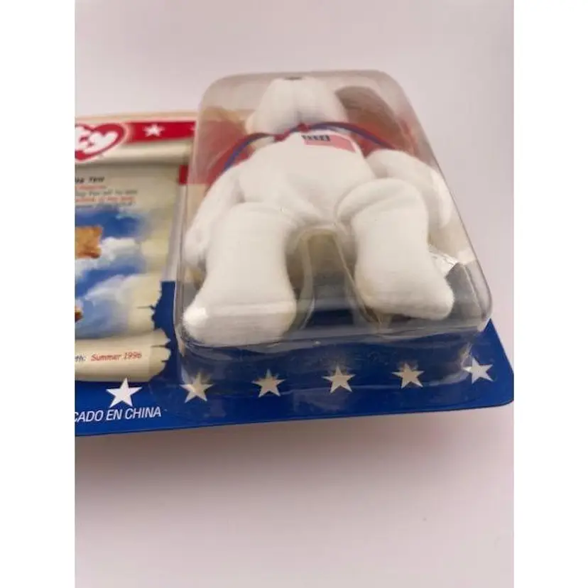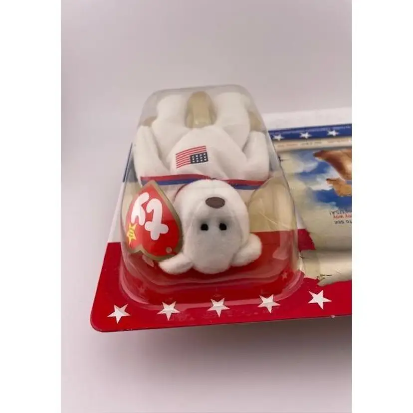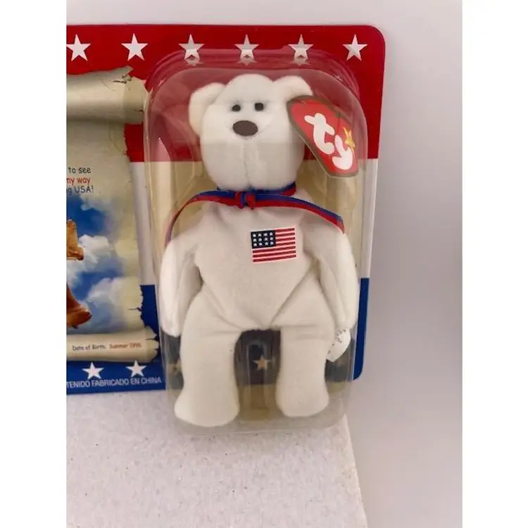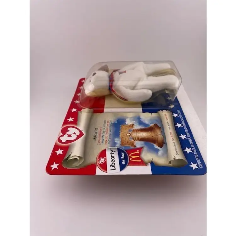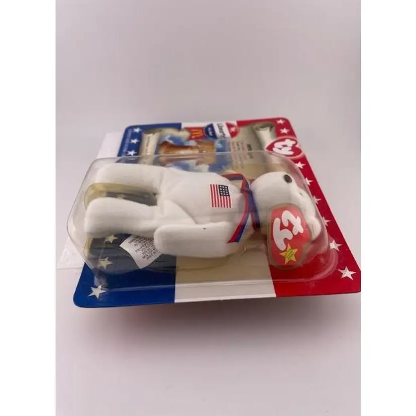 This adorable beanie baby is NIB never been opened. It is one in a series of patriotic beanie babies from McDonalds. The bear measures 5 1/4" x 3" and the package it comes in measures 7 3/4" long x 6" tall.