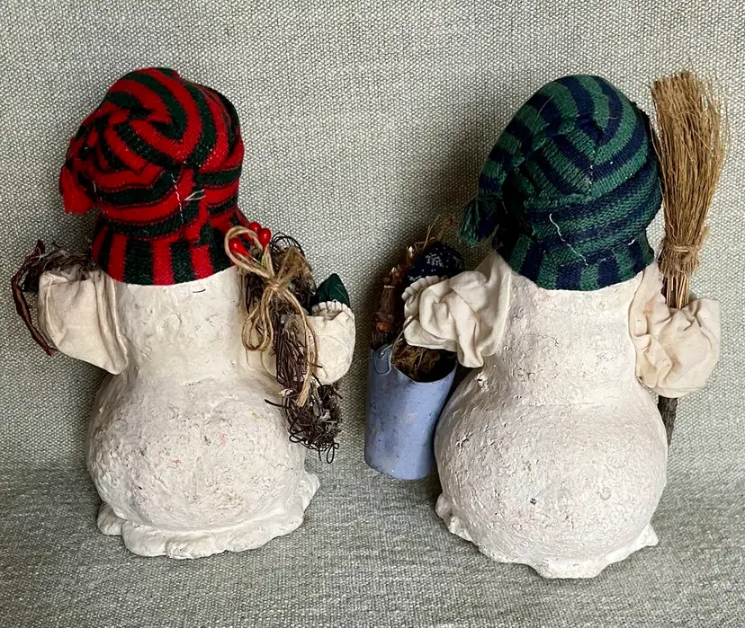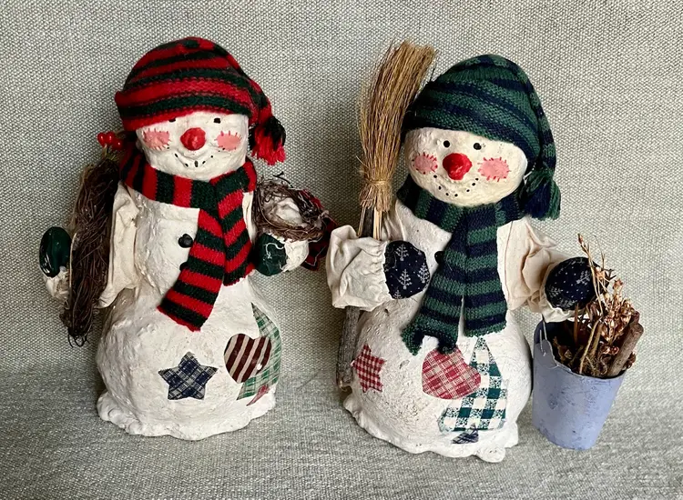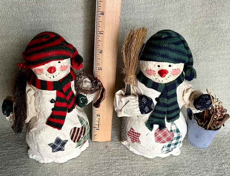 This product is a set of two embellished paper mache figurines from Crazy Mountain Imports. The figures are shaped like a snowman and have a paper mache texture. They are medium-sized, with the snowmen measuring approximately 7.5 inches in height and 4 inches in width, and together weigh one pound 4.2 ounces. These 29 years plus figurines are perfect for winter or Christmas decor.